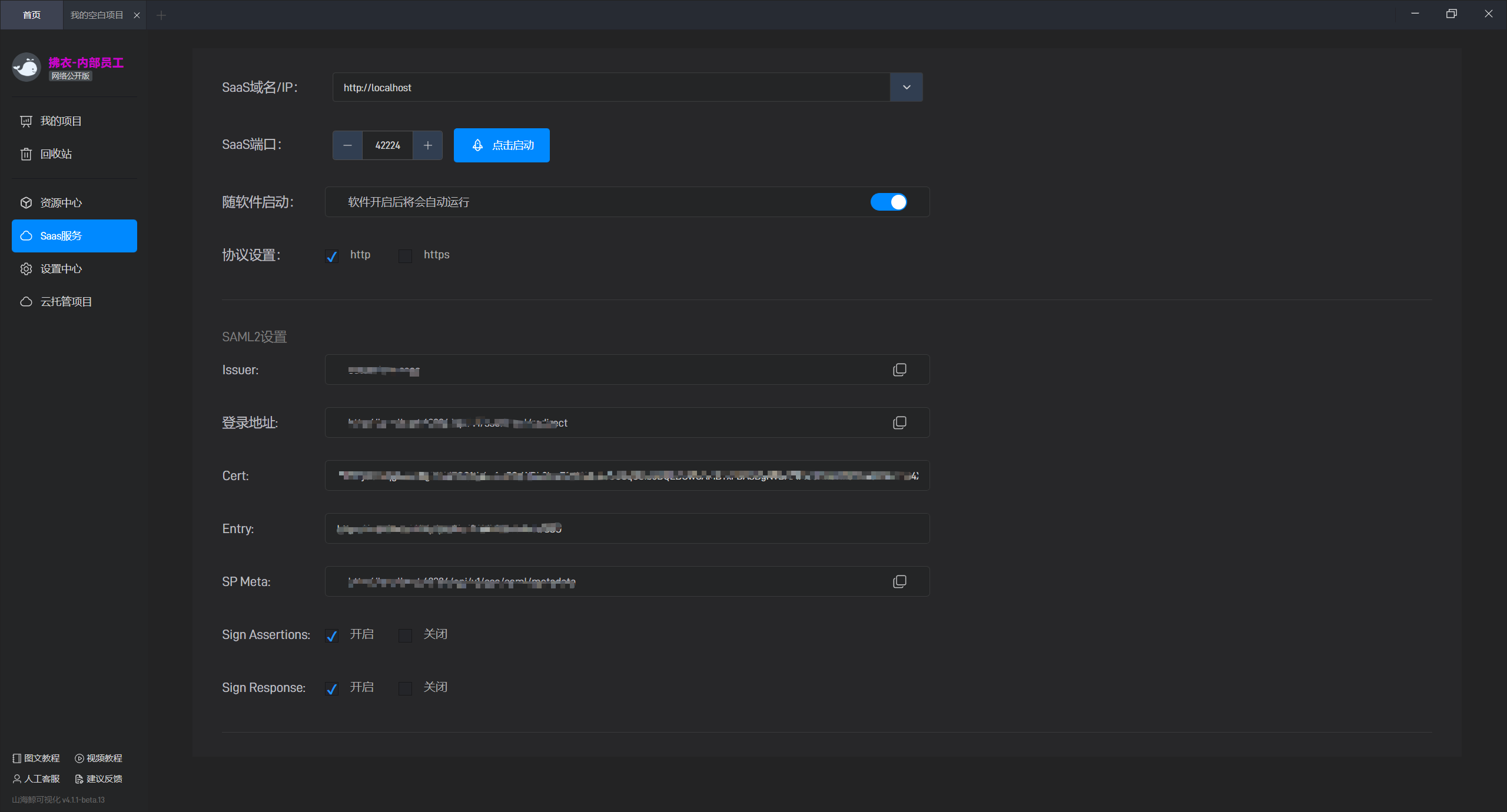 打开软件后,在软件左侧列表中找到 Saas 服务,点击按钮启动 SaaS 服务:
