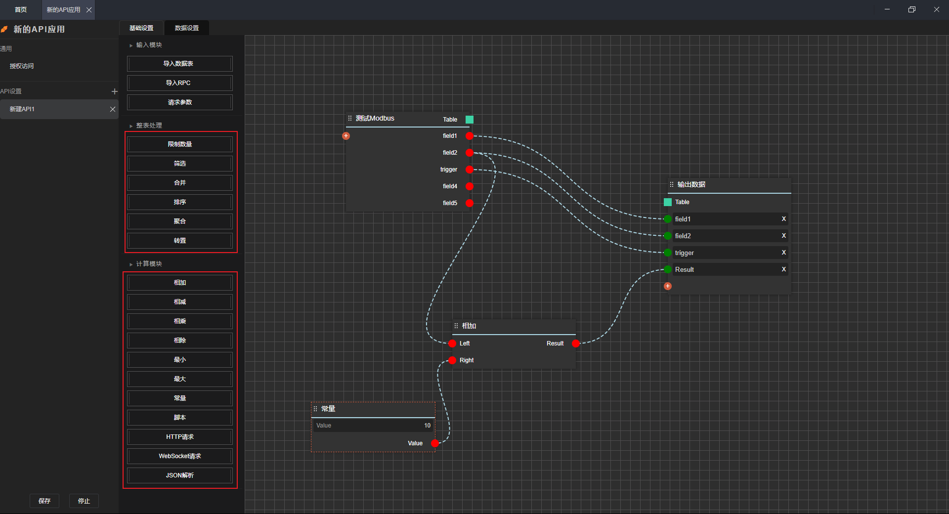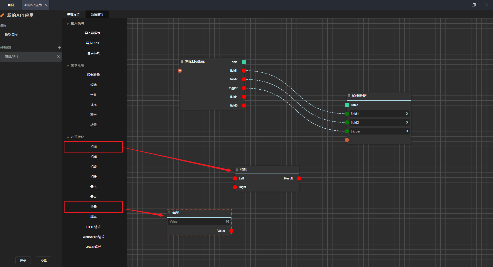 假设对field2 字段进行加法运算,我们可以直接通过拖拽的形式,将“相加”和“常量”模块拖入。