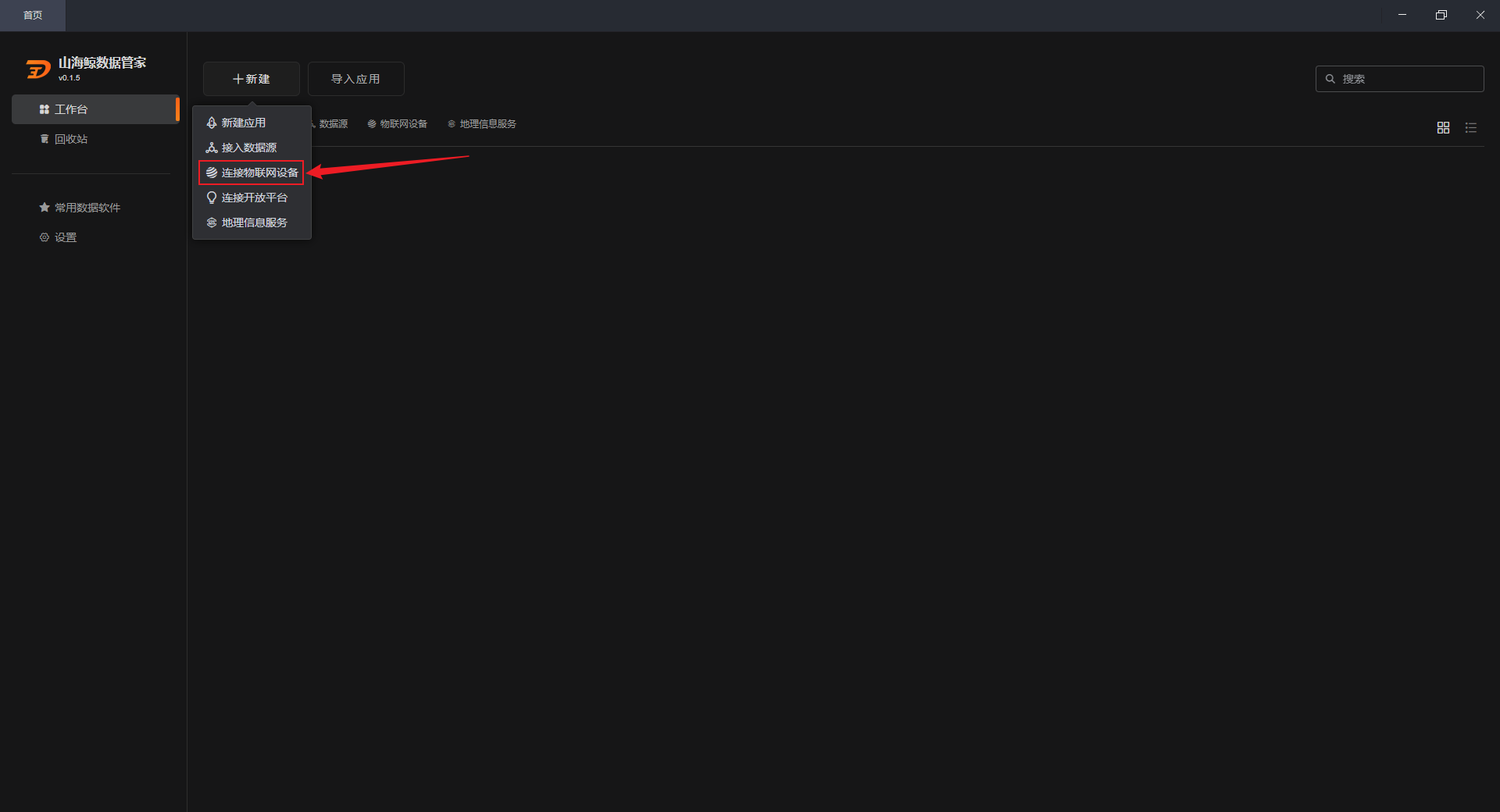 打开山海鲸数据管家,点击“新建”,点击“连接物联网设备”。