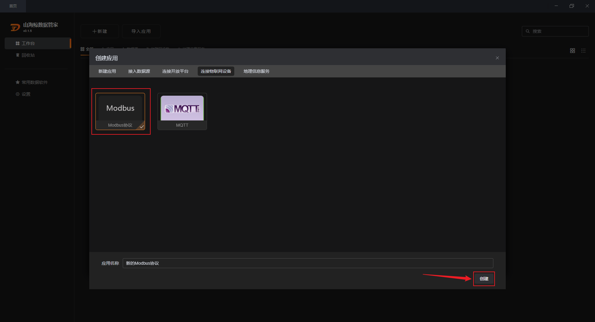 下面我们以“连接 Modbus 数据”为例进行说明,具体说明如何使用山海鲸数据管家连接Modbus Slave软件,并使用 Modbus Slave 软件模拟连接物联网设备的操作。