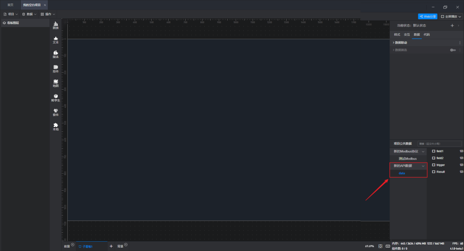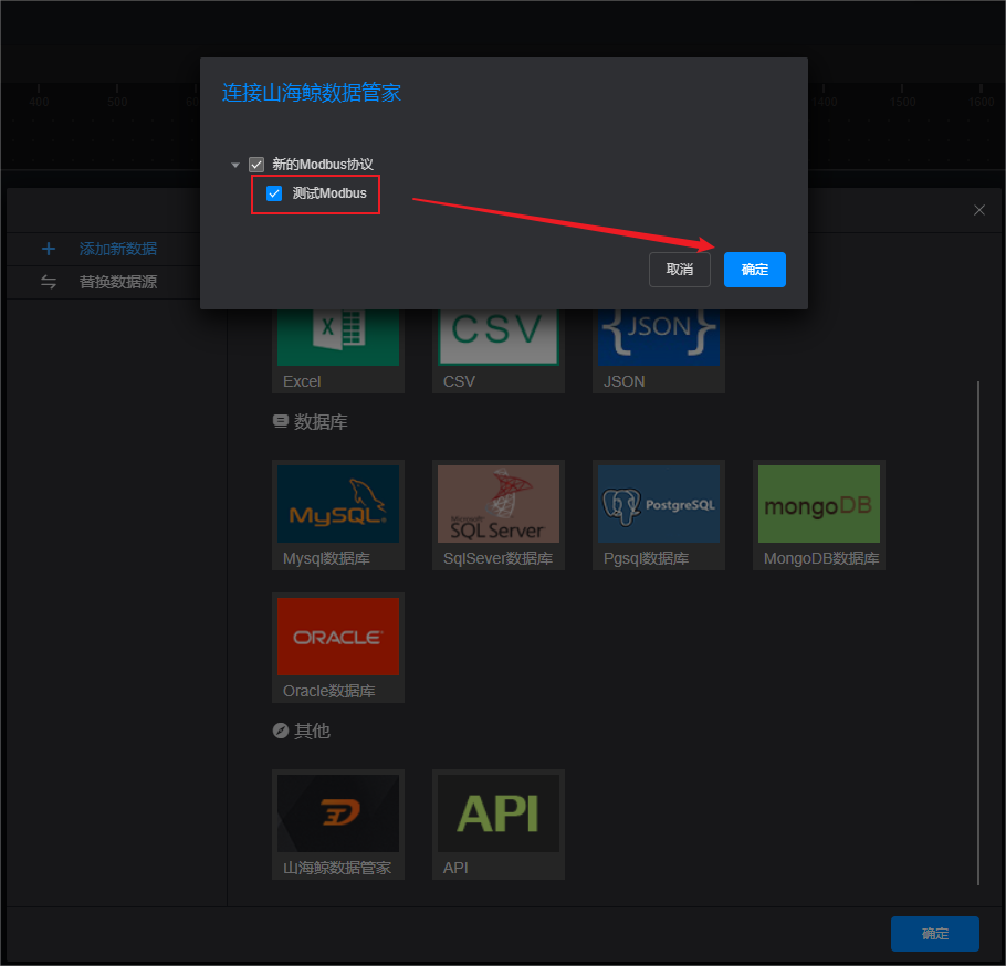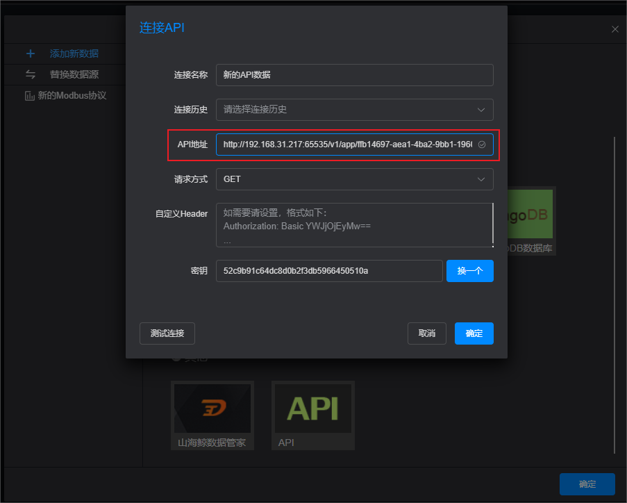 打开山海鲸可视化软件,在可视化项目中添加数据源,打开“连接数据”弹窗中,这里我们需要选择添加API 数据源连接在山海鲸数据管家中创建的API 应用,点击“确定”。