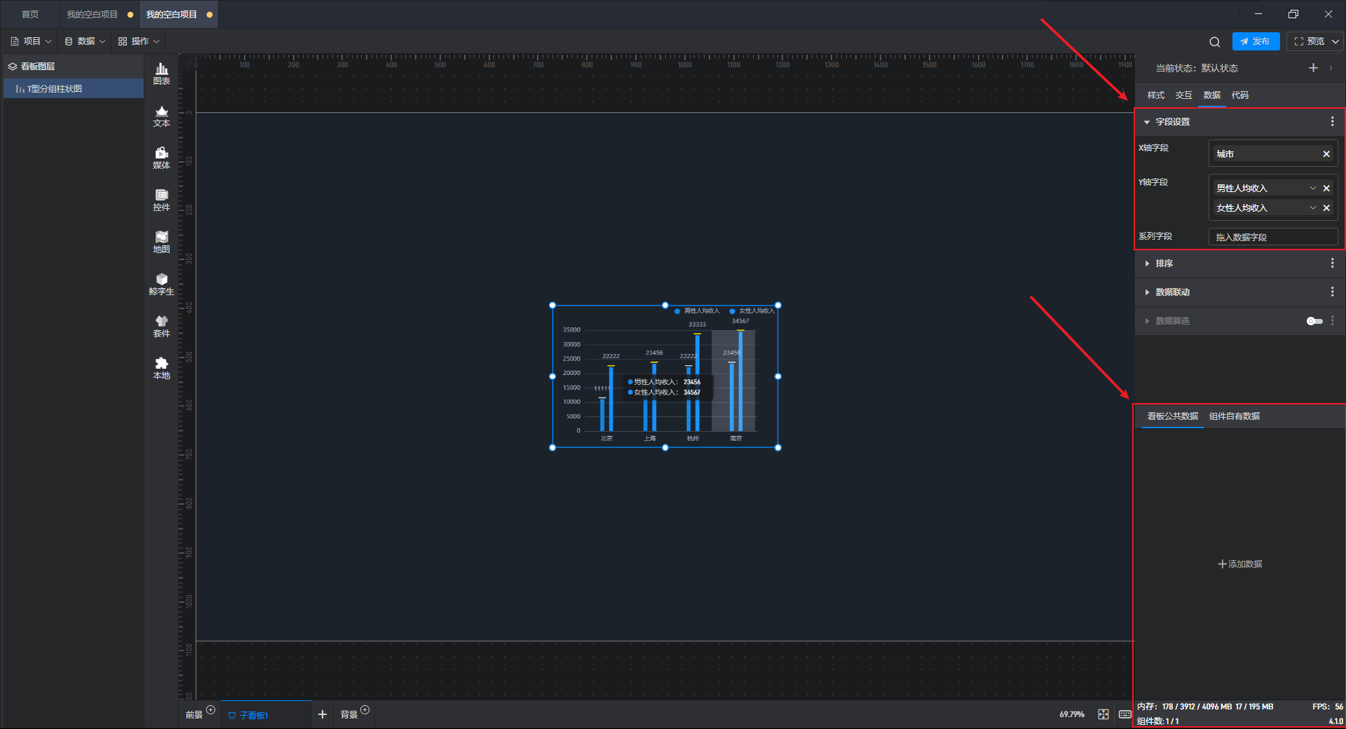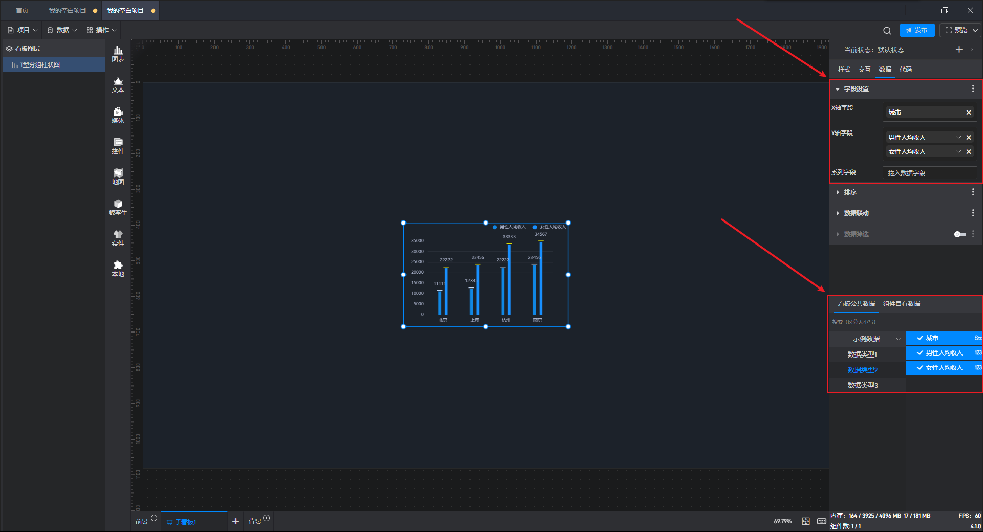 点击“确认”,会将组件设置的“数据字段”以及“数据字段”所在的数据源一并粘贴到目标项目中。