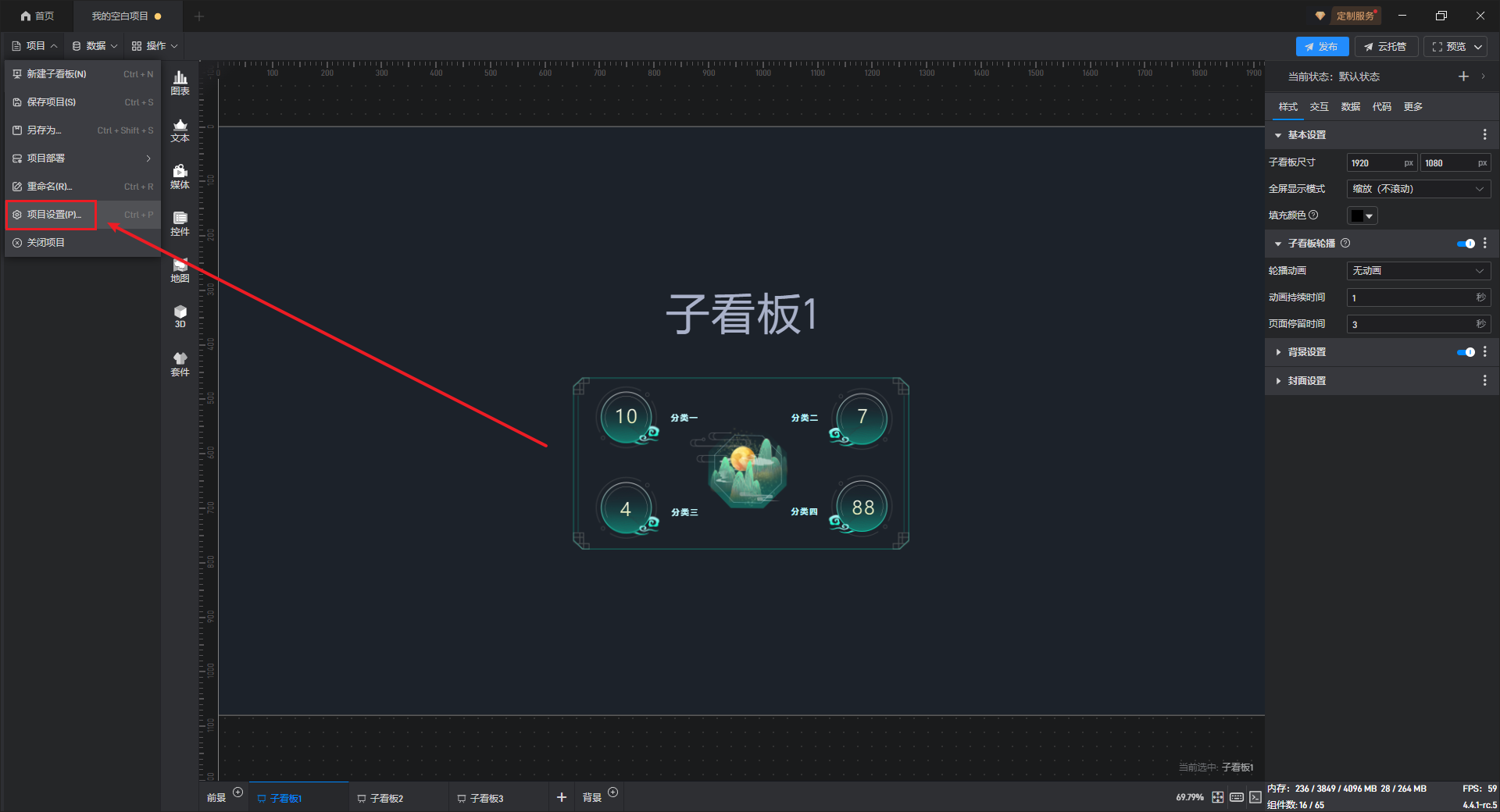 当开启所有子看板的“子看板轮播”后,我们需要设置各个子看板的演示顺序,点击左上角的“项目”,然后选择“项目设置”。