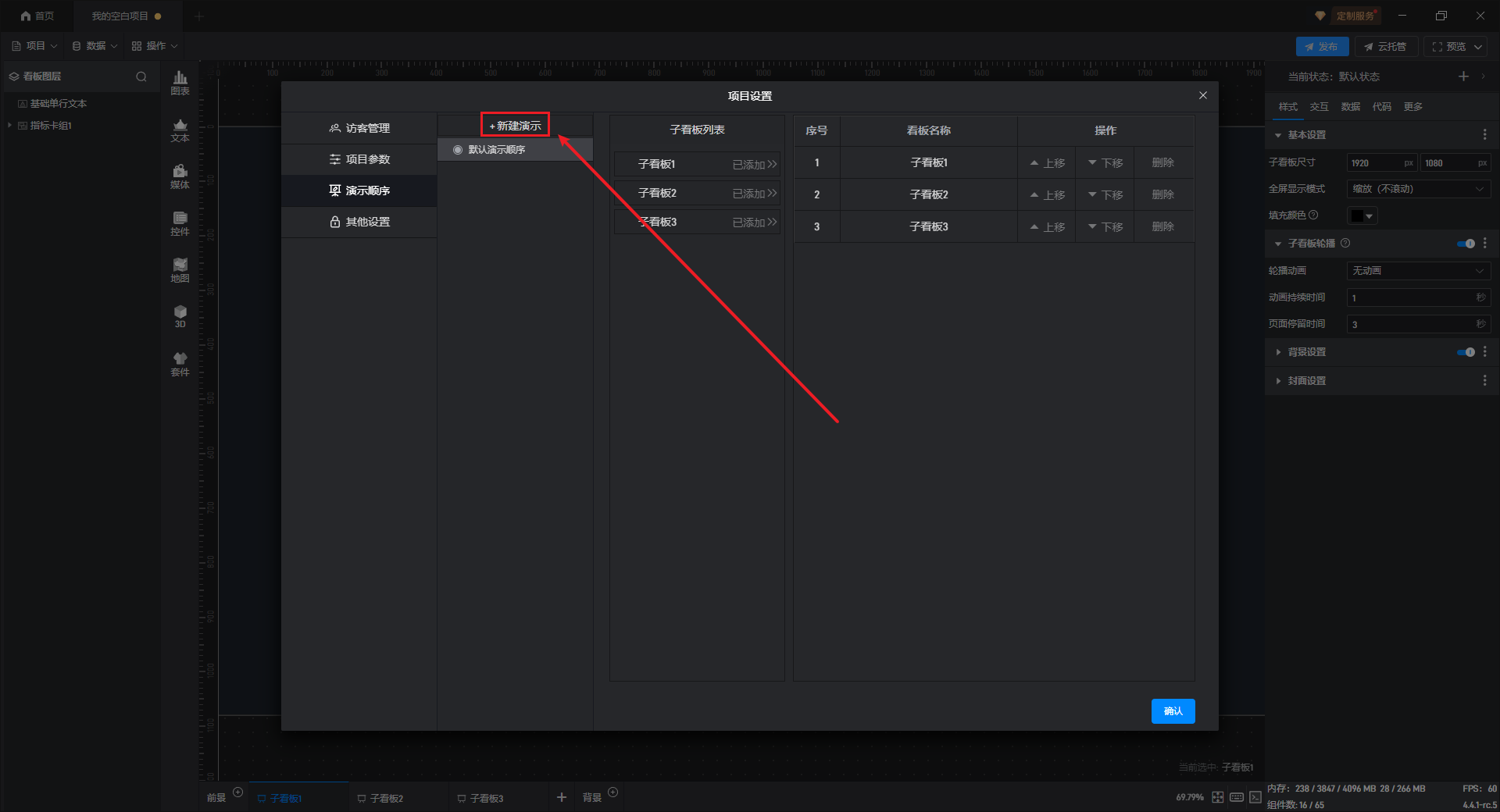 如果需要增加新的演示顺序,我们可以点击“+新建演示”按钮来添加,如下图所示: