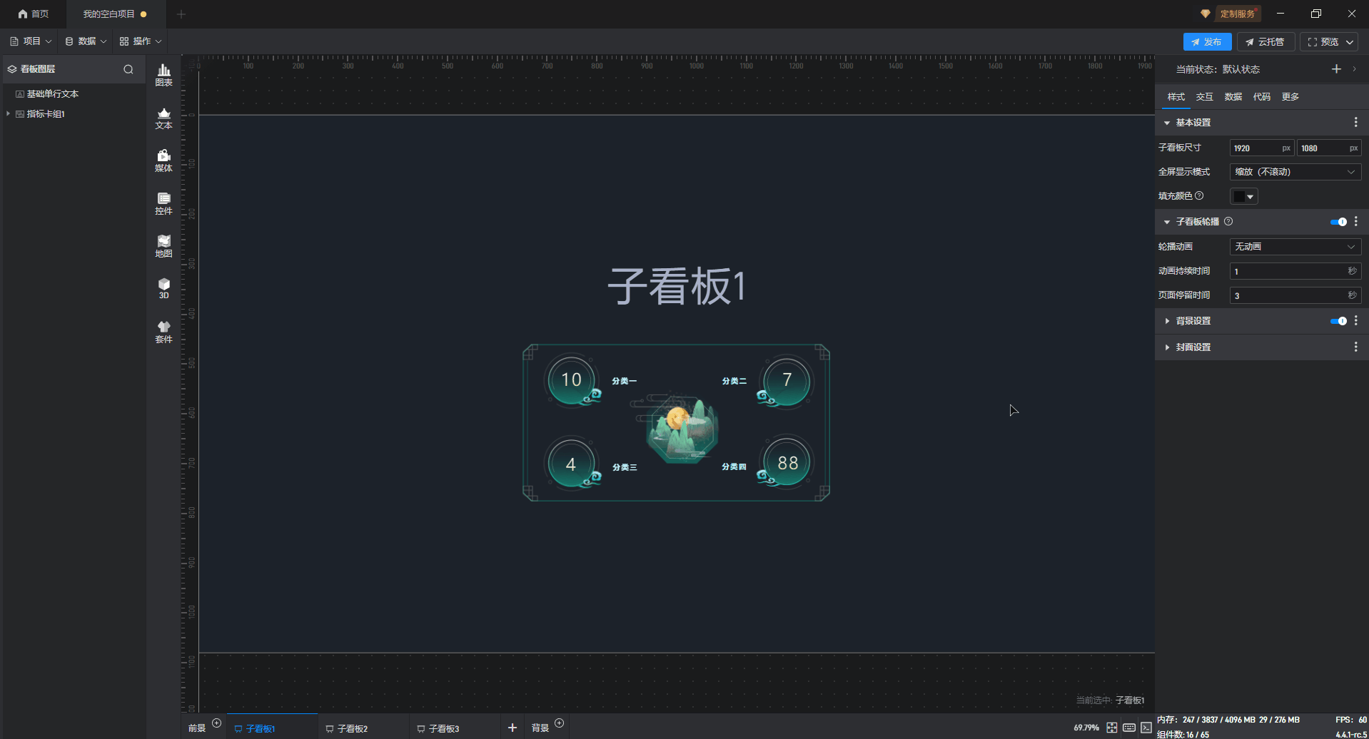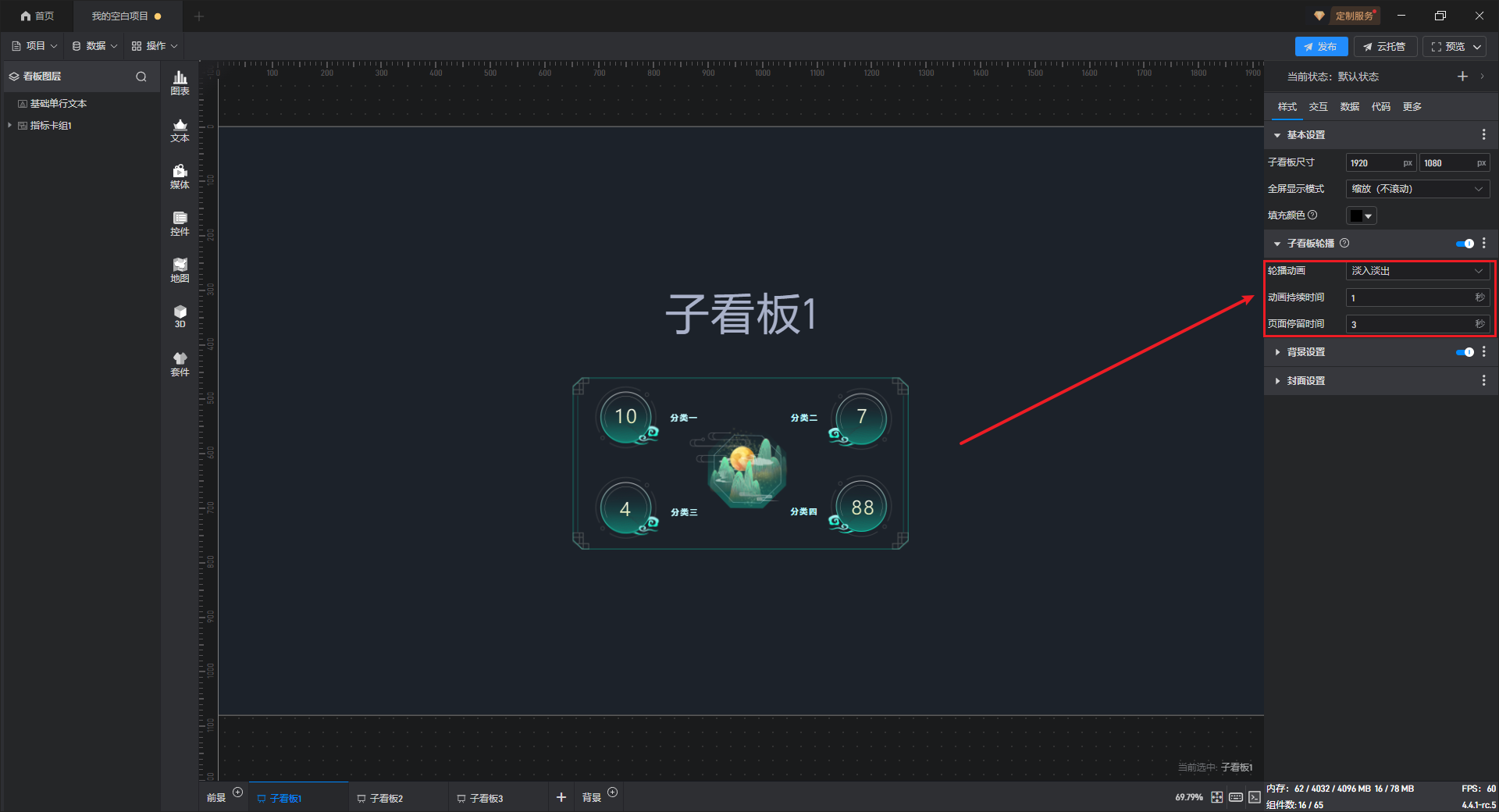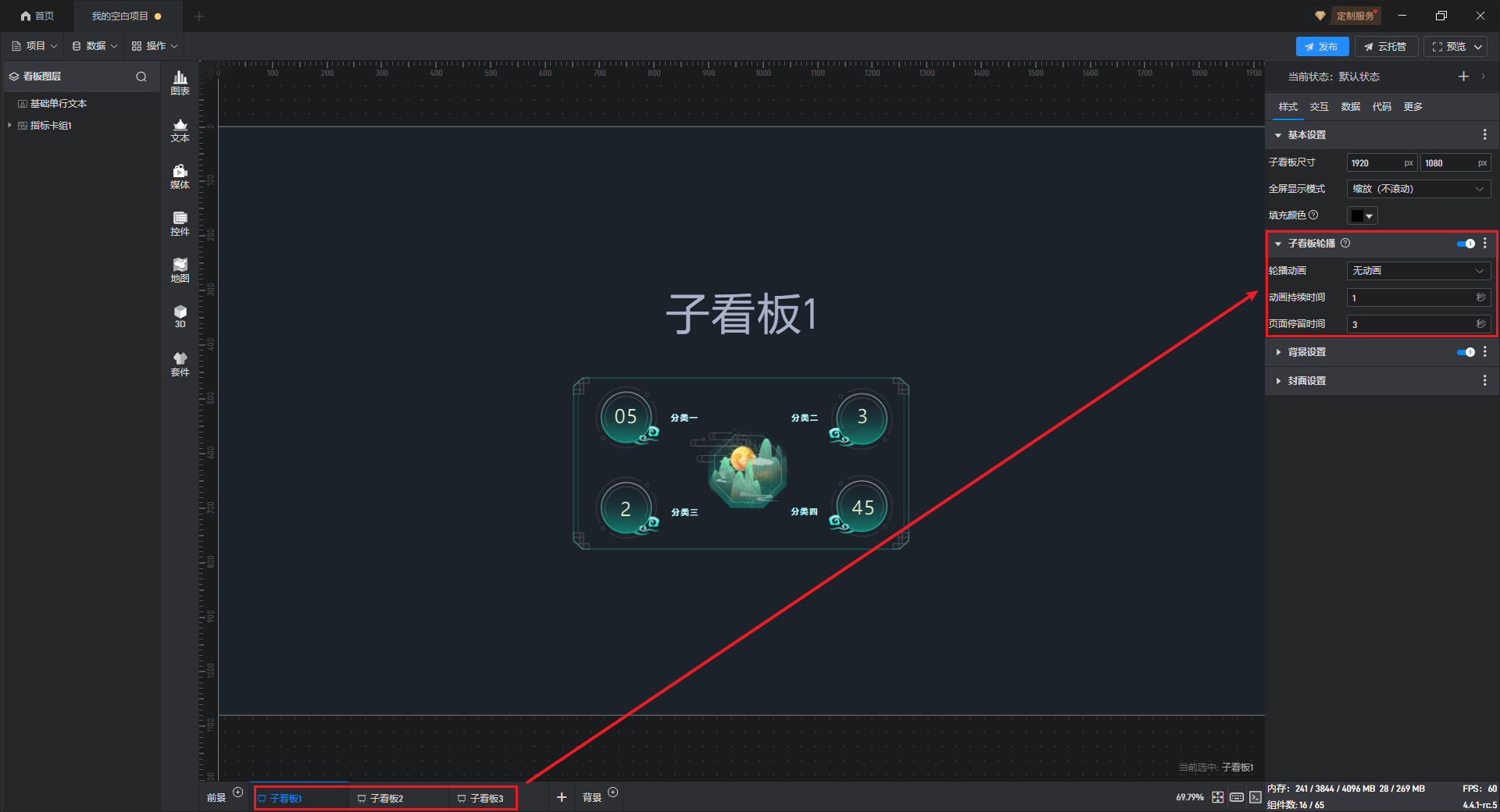 在下方的示例项目中,共创建了三个子看板,每个子看板分别添加了不同的组件,我们依次选中这三个子看板,然后在样式中开启了“子看板轮播”(注意这个设置项是在子看板上进行设置,如果选中了某个组件,需要先点击画布空白区域来切换到子看板设置)。
