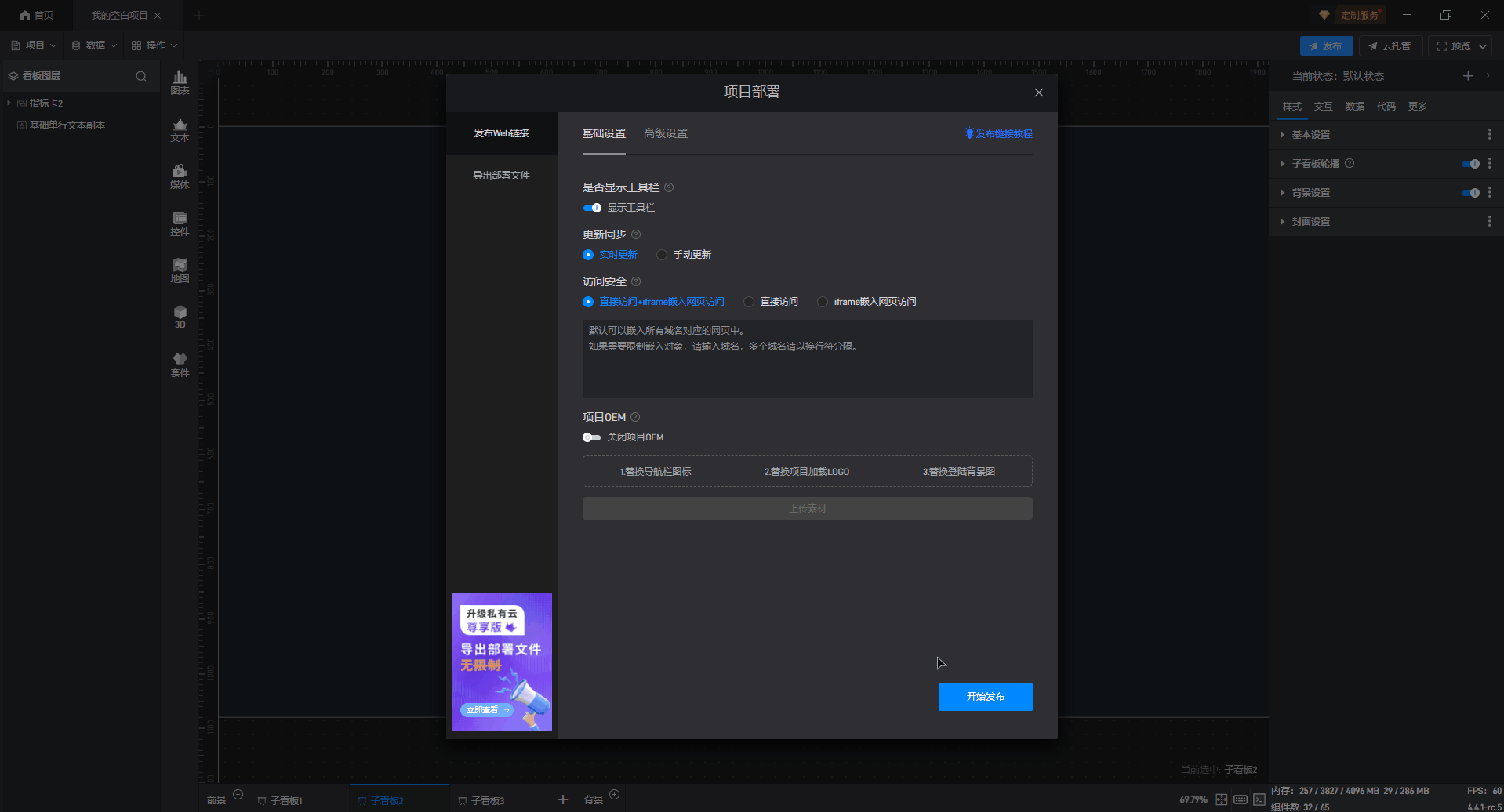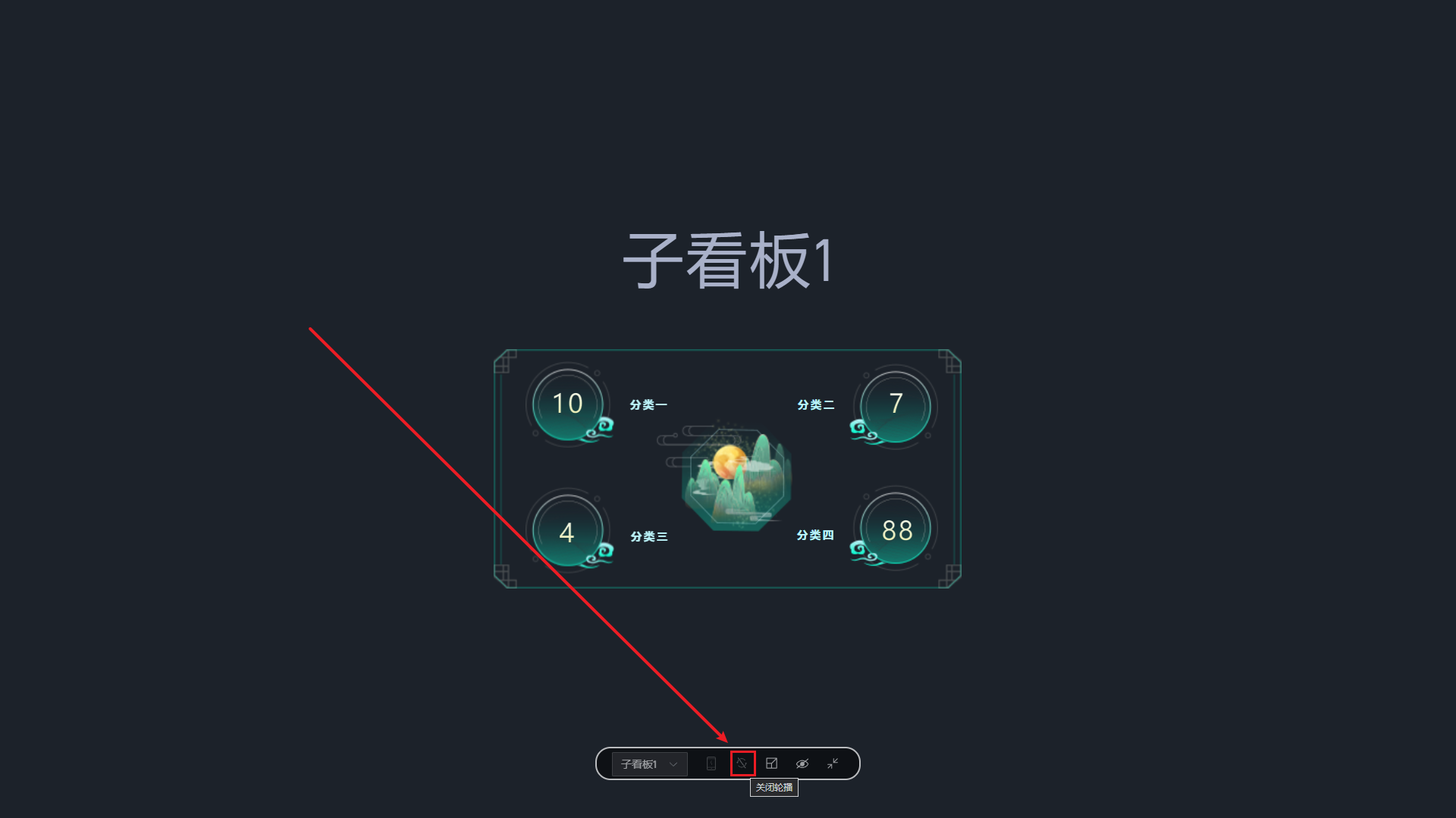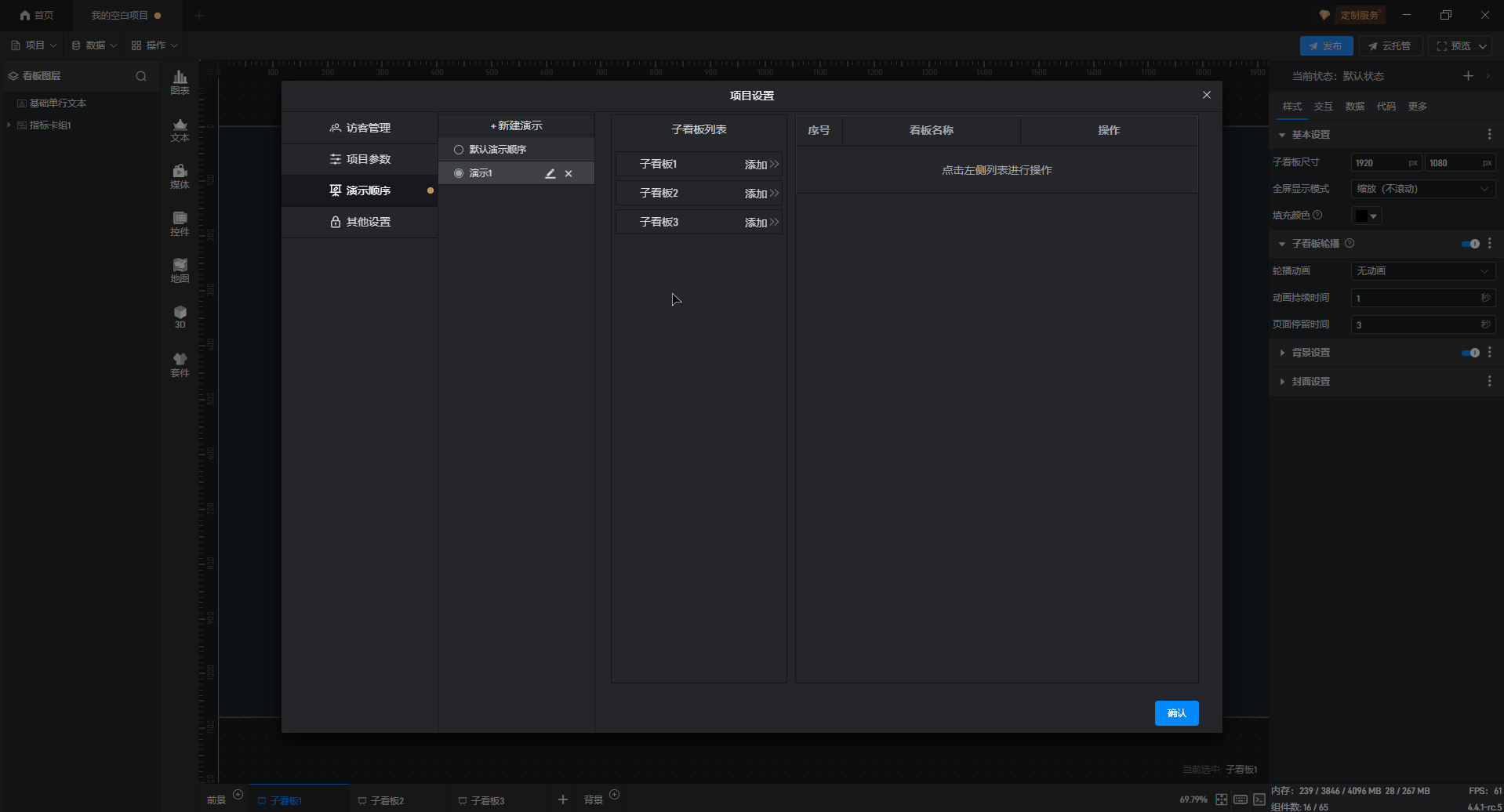 在下方的示例项目中,共创建了三个子看板,每个子看板分别添加了不同的组件,我们依次选中这三个子看板,然后在样式中开启了“子看板轮播”(注意这个设置项是在子看板上进行设置,如果选中了某个组件,需要先点击画布空白区域来切换到子看板设置)。