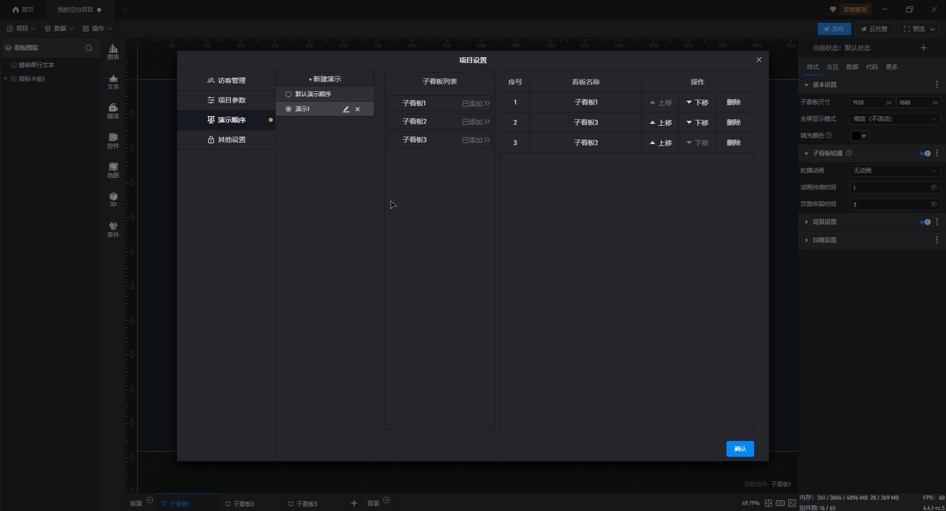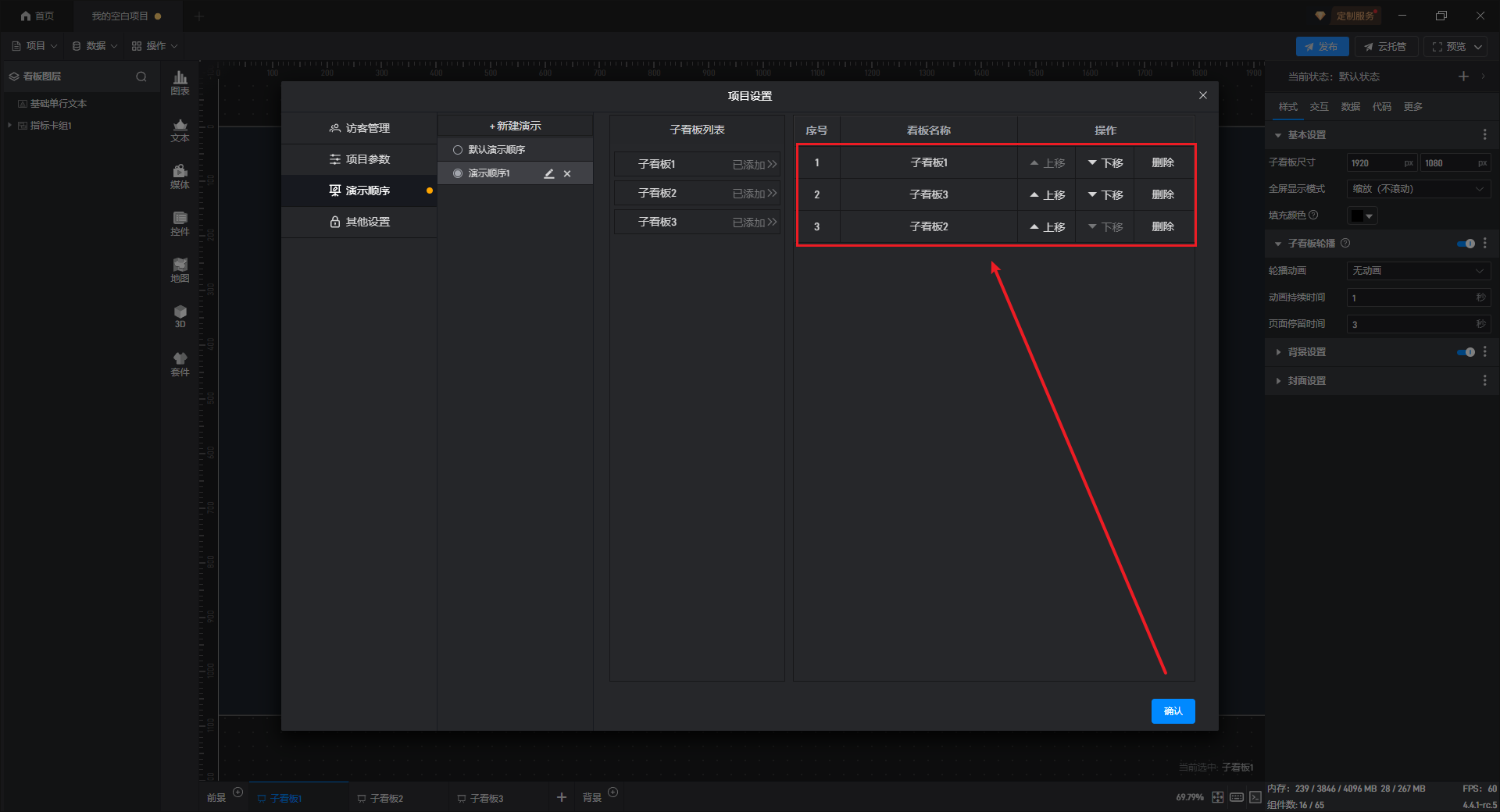 在子看板列表中可以添加需要演示的子看板,并且还可以更改它们的顺序(“上移、下移”),如下图所示: