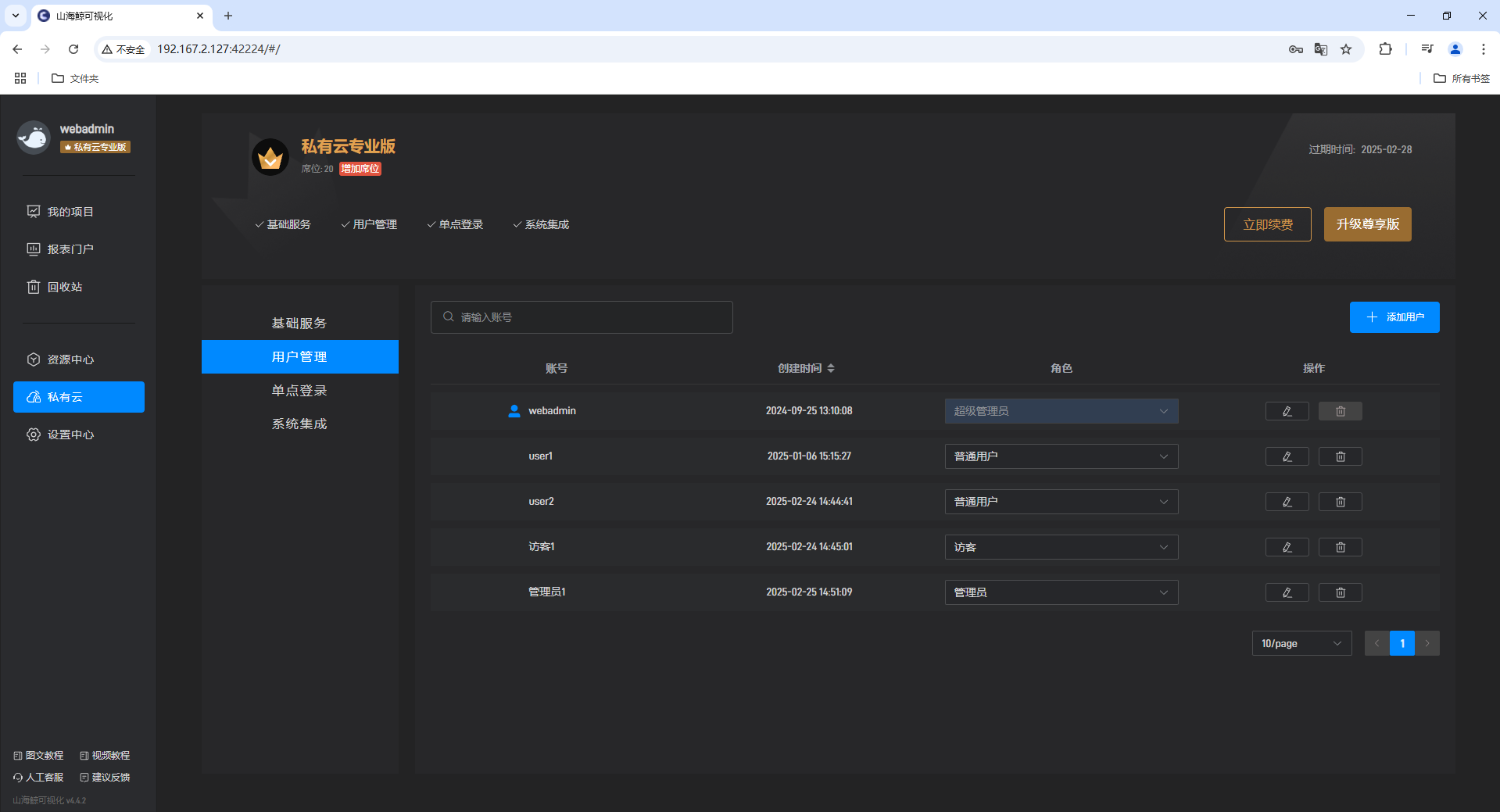 其中普通用户可以看到自己创建的内容、共享的内容和管理员创建的内容。这里我们分别创建两个角色为普通用户的账号:user1 和 user2,分别登陆这两个子账号,然后创建“user1-项目”和“user2-项目”两个文件夹。
