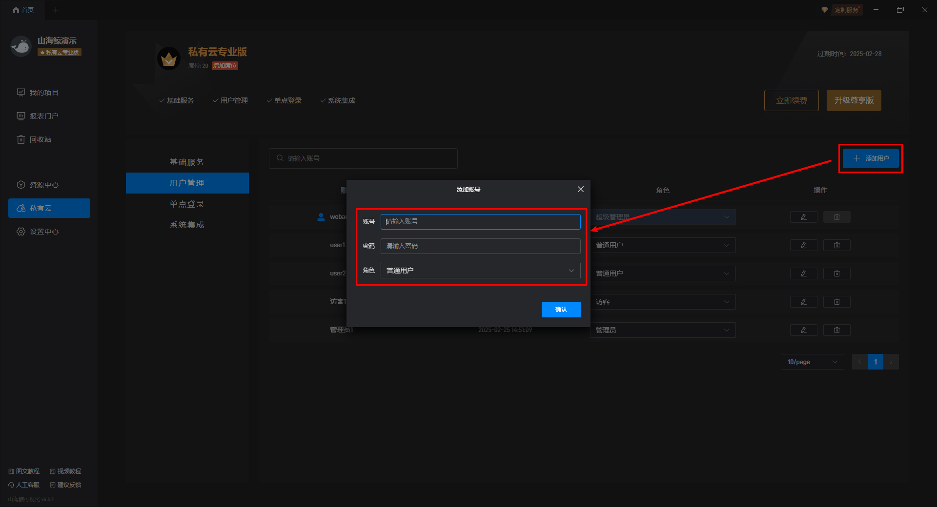 在私有云的用户管理设置中,我们可以对账号进行管理,账号按照角色可分为:管理员、普通用户、访客。