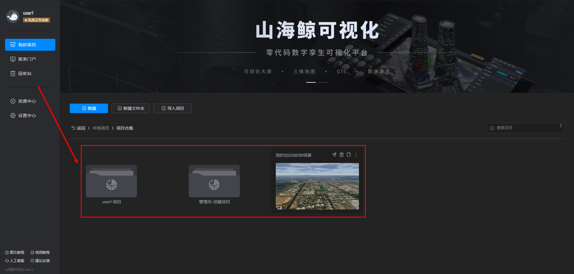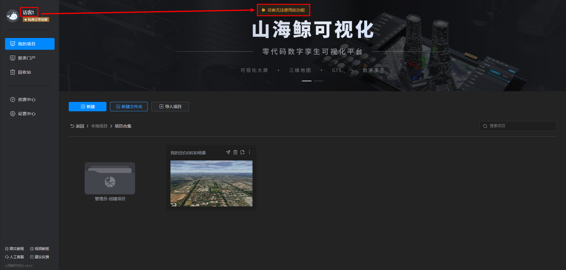 角色为访客的账号无法创建和导入项目,也无法创建文件夹,只能查看管理员创建的内容,如下图所示: