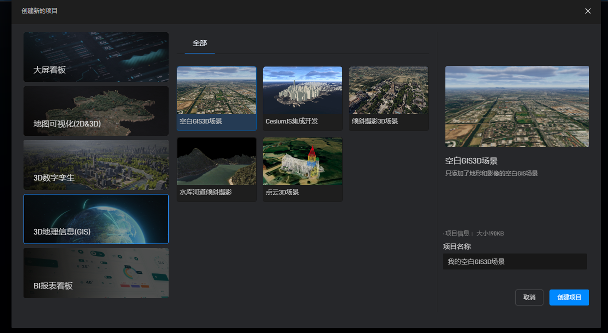 在山海鲸>新建项目>创建 3D 地理信息(GIS)>空白 GIS3D 图层。