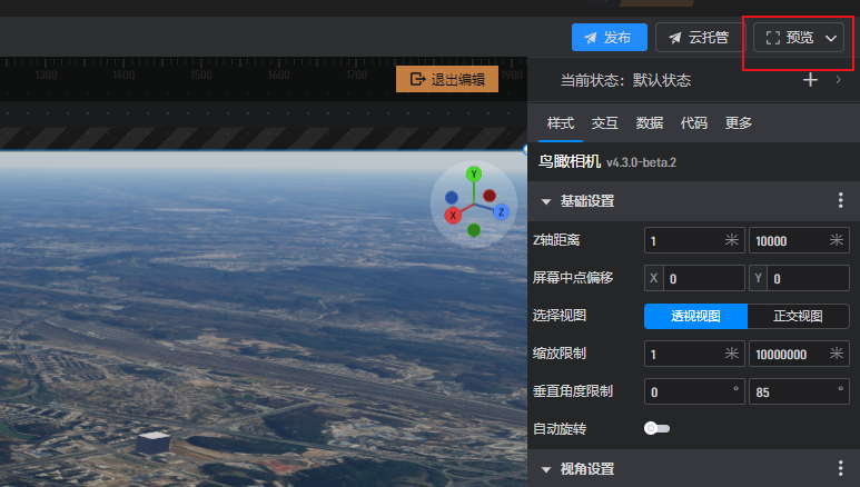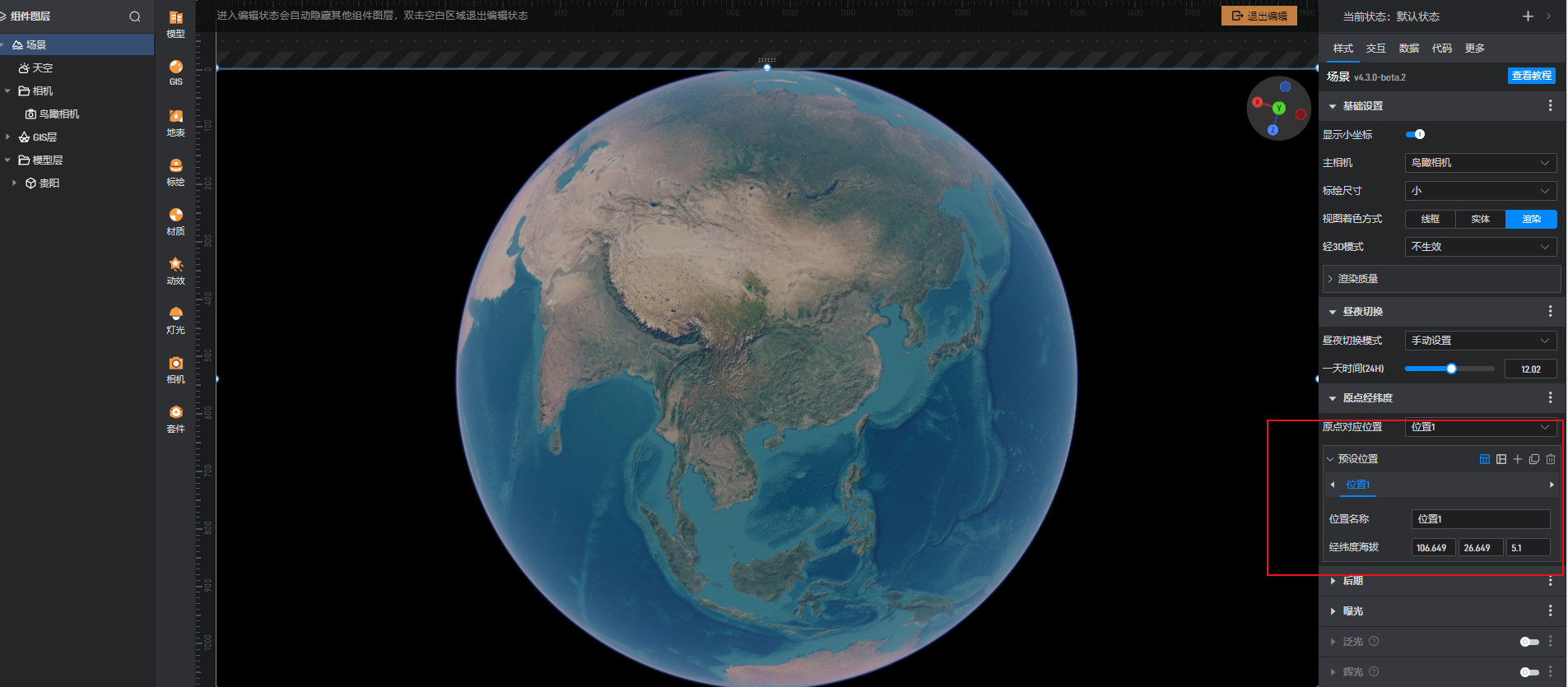 选中山海鲸左侧场景设置栏,然后在右侧预设位置设置我们获取到的经纬度。