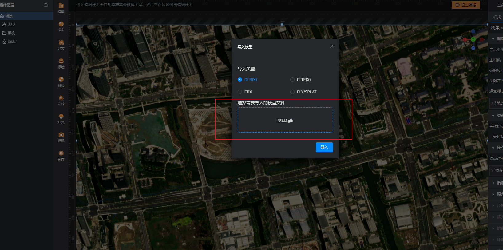 将建好的模型以 glb 导出,然后导入山海鲸 GIS 项目查看是否对应上位置。