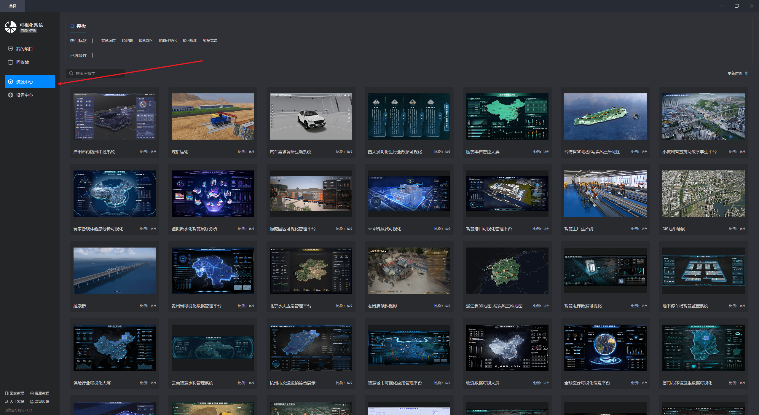点击“资源中心”菜单打开资源中心界面,如下图所示: