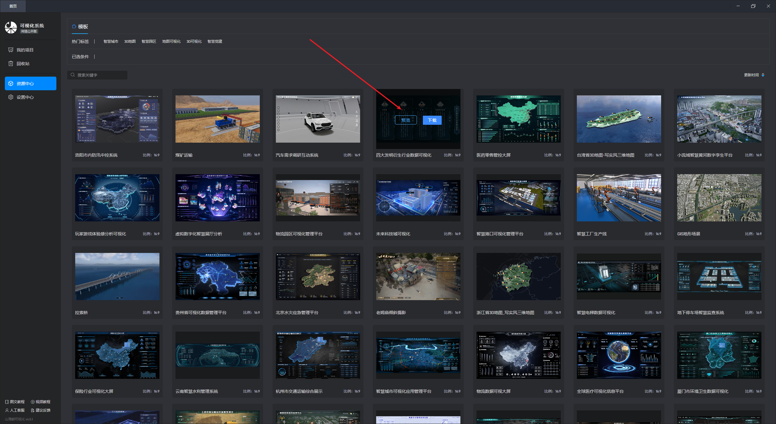 在山海鲸可视化软件中的资源中心,我们提供了大量的项目资源,包括模板、模型和素材等,您可以通过以下方式下载。