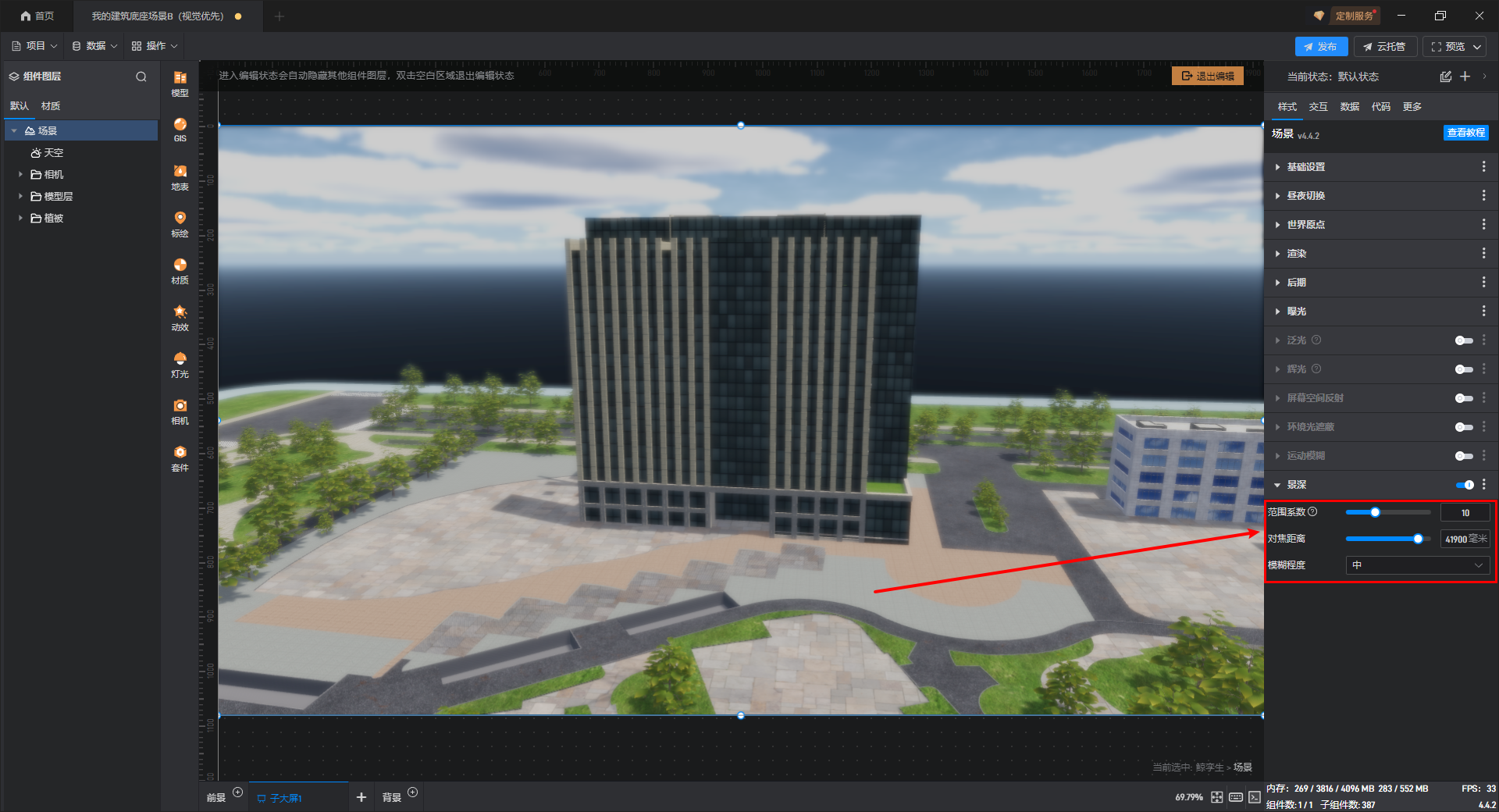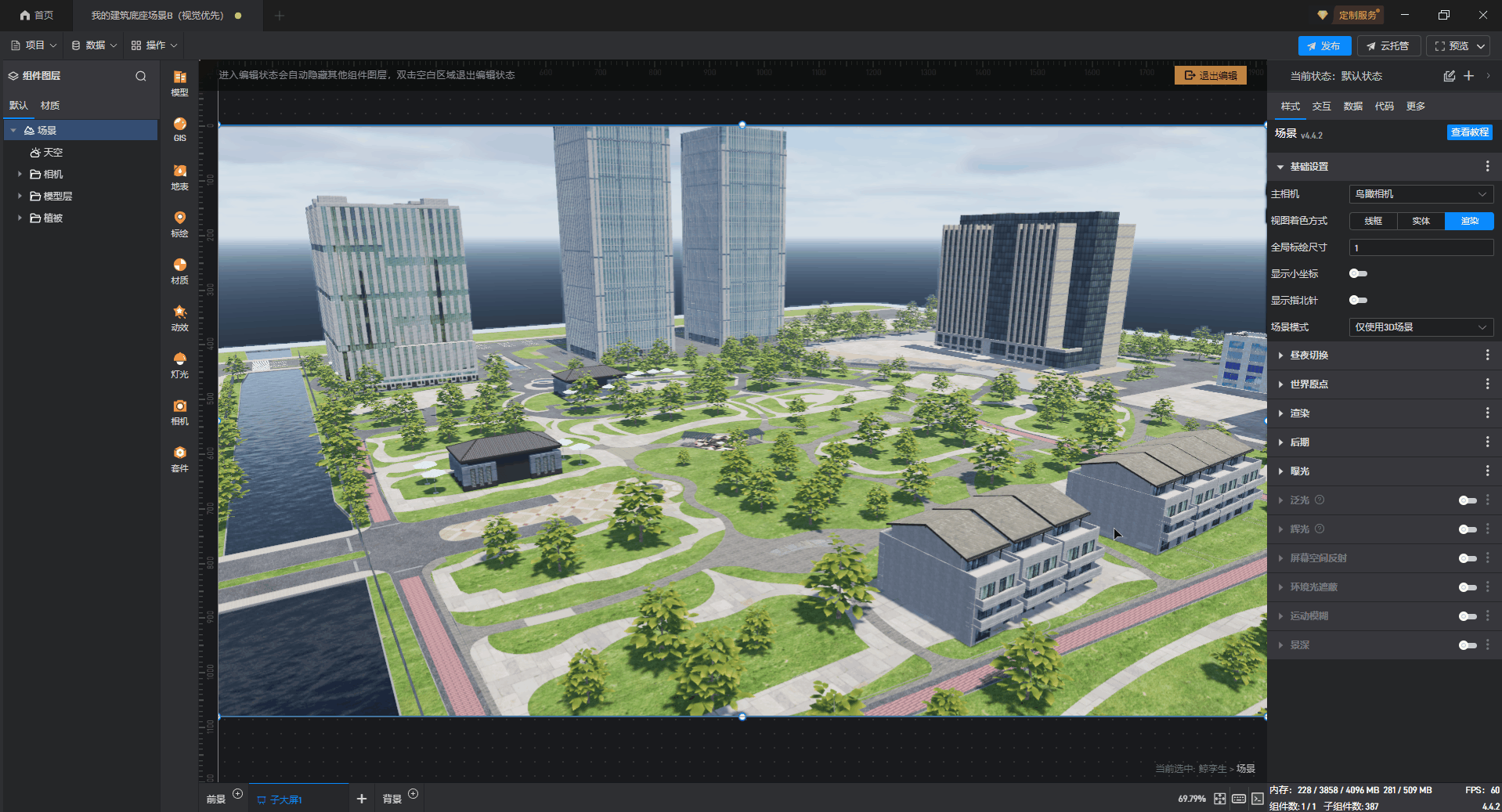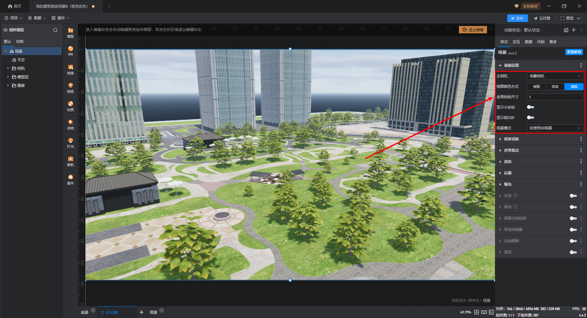 | 场景模式 | 自定义选择场景呈现的方式,分别有“仅使用 3D 场景”、“仅使用 2.5D 场景”和“自动切换 3D 和 2.5D 场景”。 |