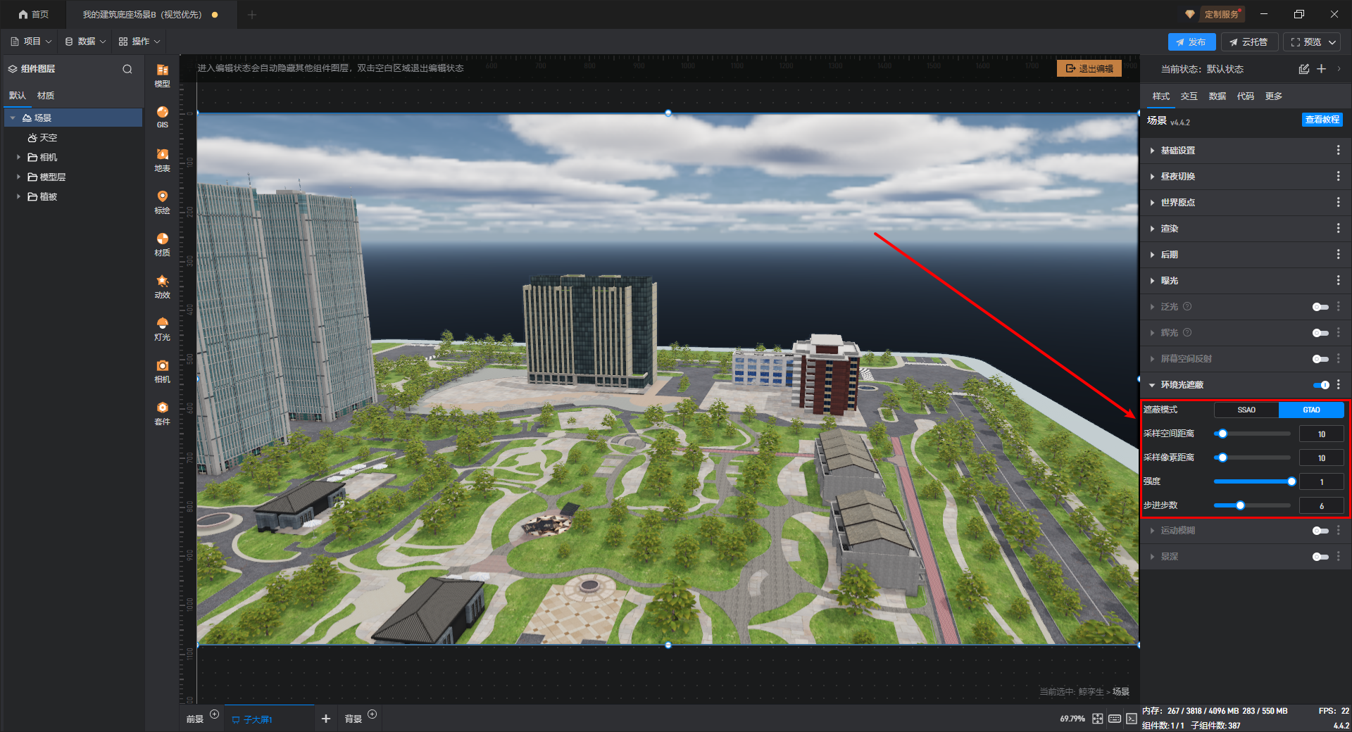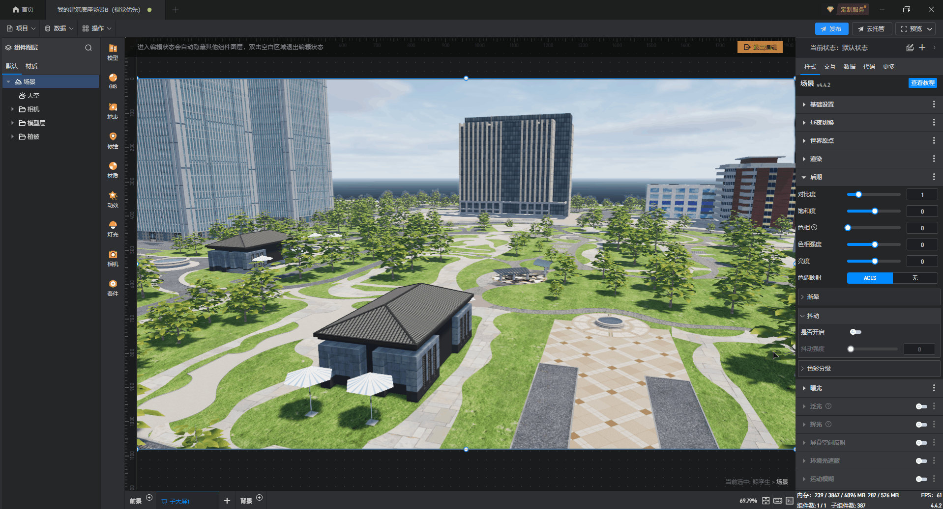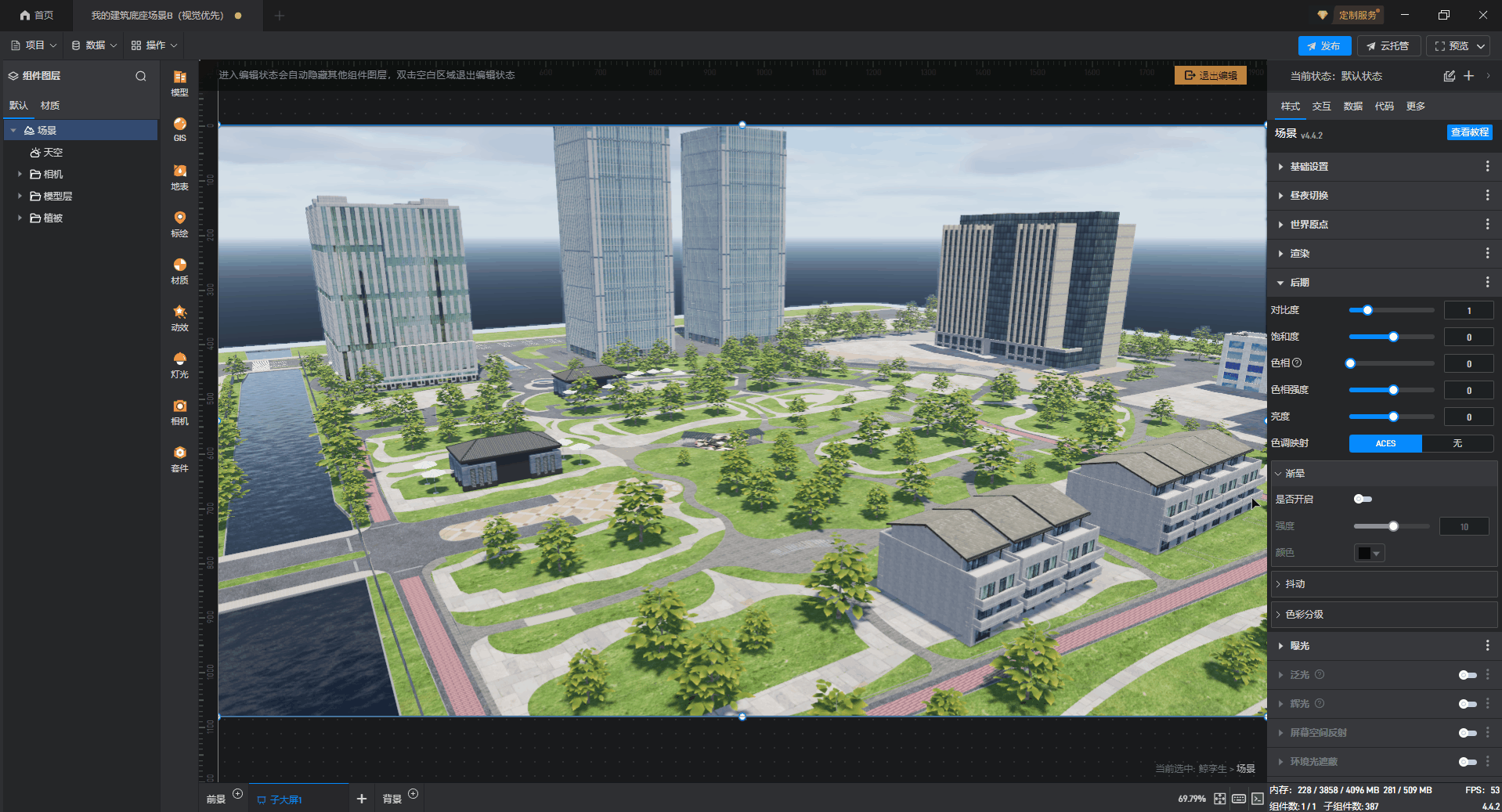 场景组件上的设置整体分为四大类,分别是“基础设置”、“昼夜切换”、“世界原点”、“渲染”和“后期处理”。后期处理又分了很多子分类,下面逐个进行介绍: