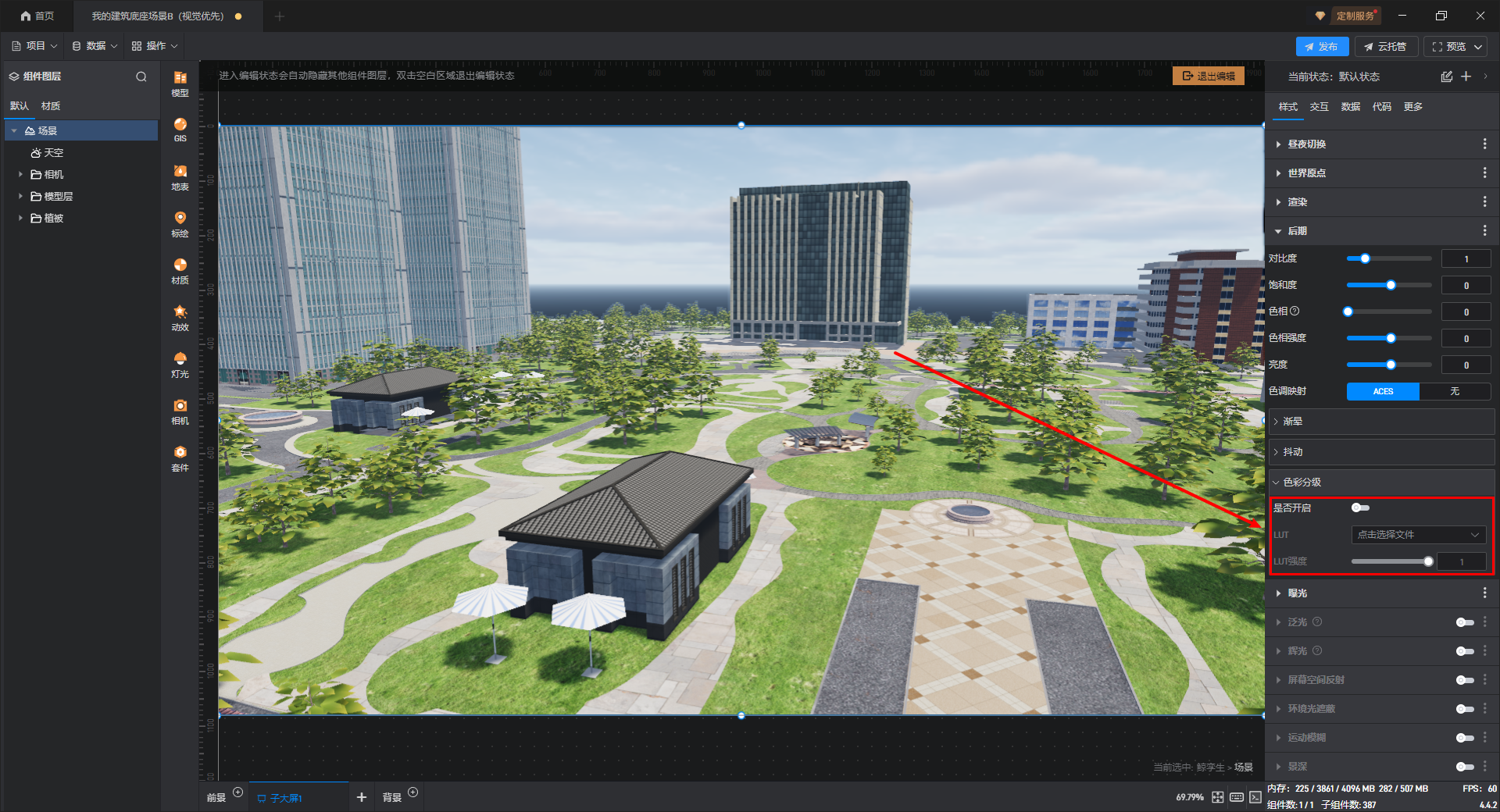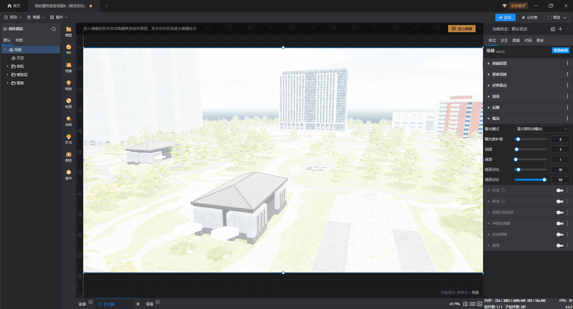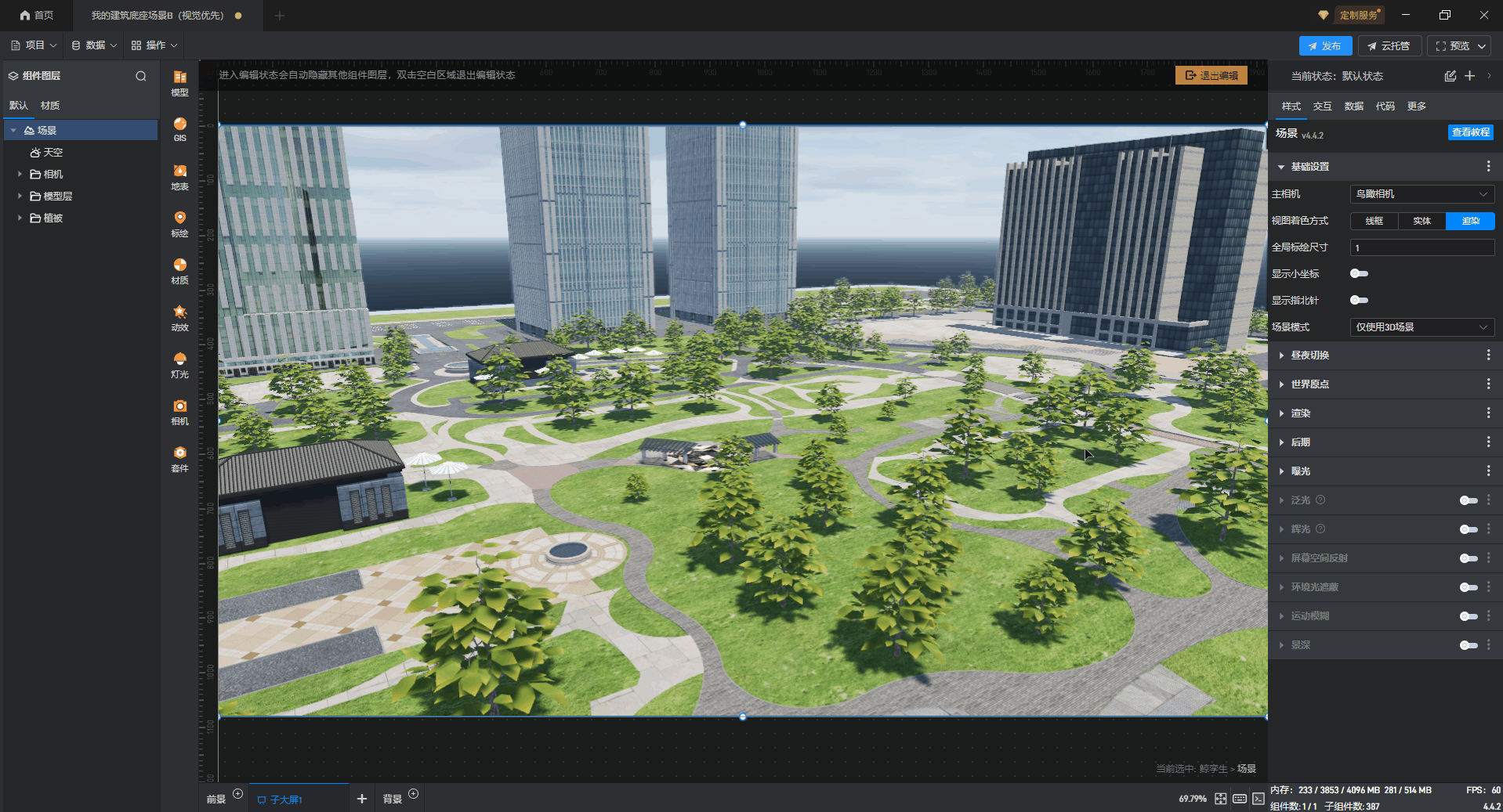 场景组件上的设置整体分为四大类,分别是“基础设置”、“昼夜切换”、“世界原点”、“渲染”和“后期处理”。后期处理又分了很多子分类,下面逐个进行介绍: