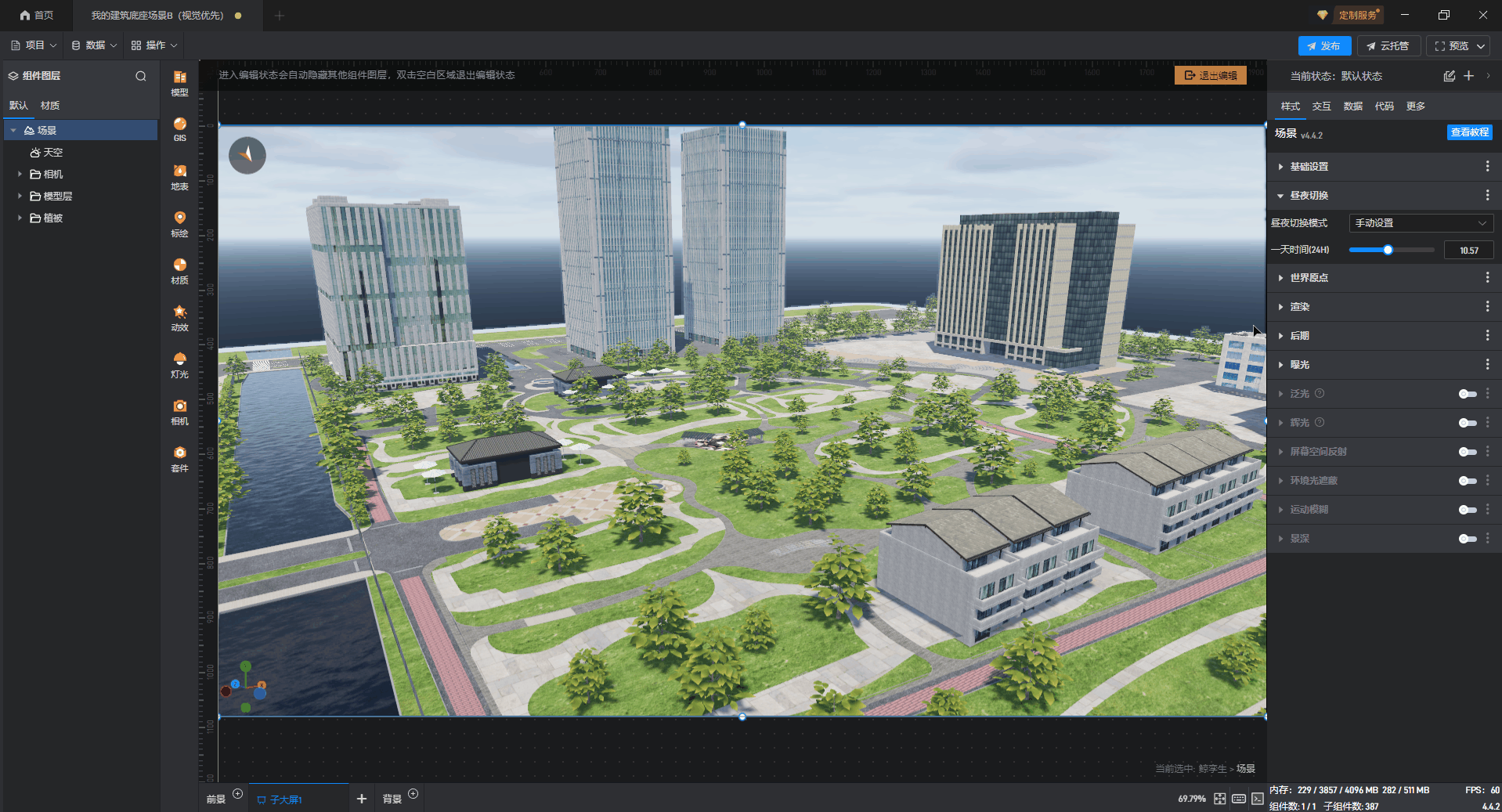 昼夜切换支持三种模式,分别是“手动设置”、“时间流逝”和“系统时间”,昼夜切换模式会同步影响太阳的高度,从而影响天空中太阳光的角度和动态天空的颜色等各个属性。