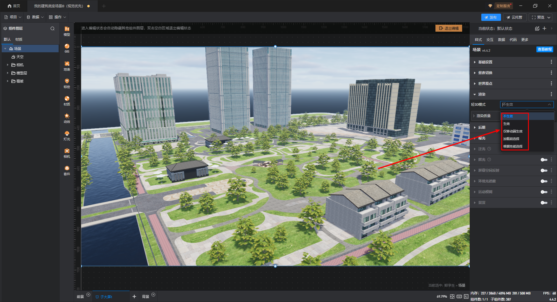 开启轻 3D 功能,能够大幅降低实时渲染对硬件设备的要求,确保了即使在配置较低的计算机或移动设备上也能实现流畅的浏览和交互,轻 3D模式一共有五种,分别是:“不生效”、“生效”、“仅移动端生效”、“加载前选择”、“根据性能选择”。