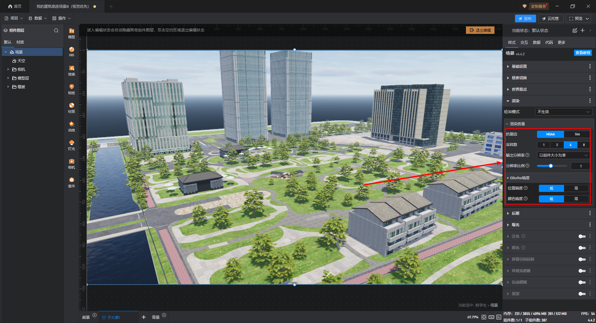 | 抗锯齿 | 当前使用的抗锯齿算法,“MSAA”能够有效消除锯齿,对性能的影响相对较小,实现相对简单;“TAA”在处理动态场景和高分辨率图像时表现出色,适用于实时渲染的游戏等应用,推荐“MSAA”。 |