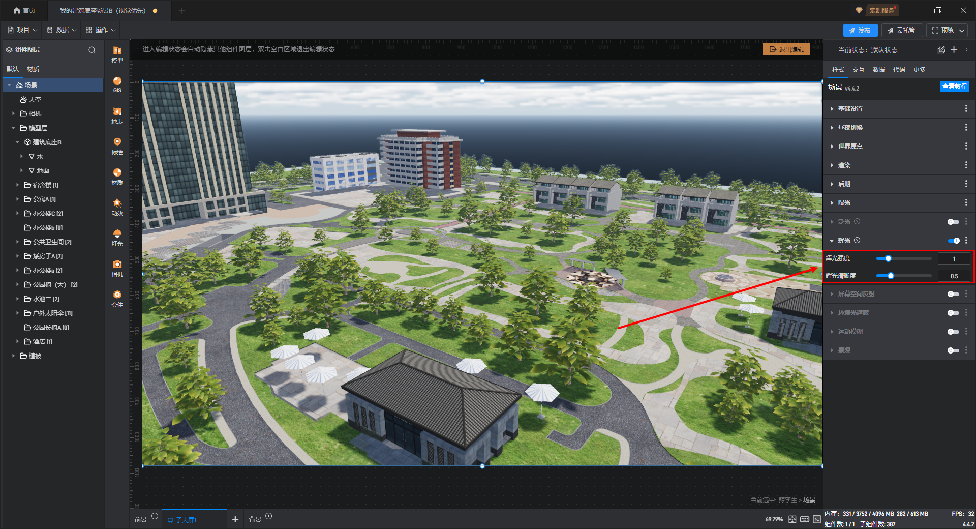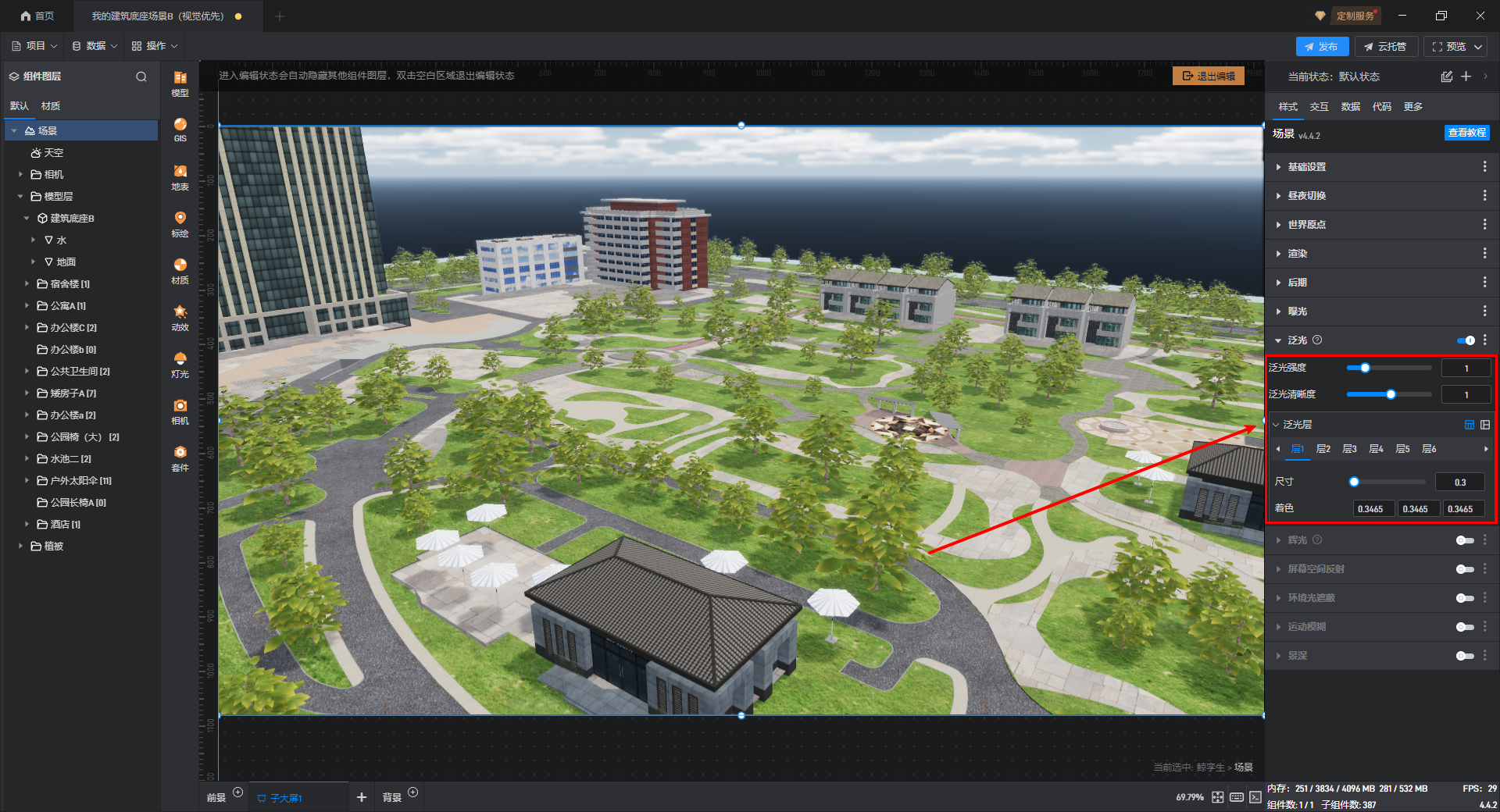 | 泛光层 | 直接对泛光后处理算法的每一步进行调整,可实现精细的调整泛光质量和反光颜色效果,此选项不建议大家修改。 |