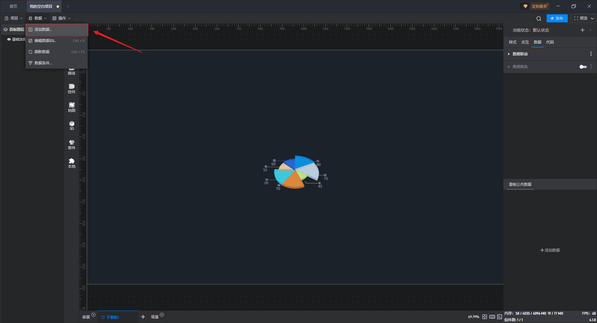 点击选中组件,在右侧“数据”设置窗口中切换到“看板公共数据”(同一个项目中所有数据源是共享的)。