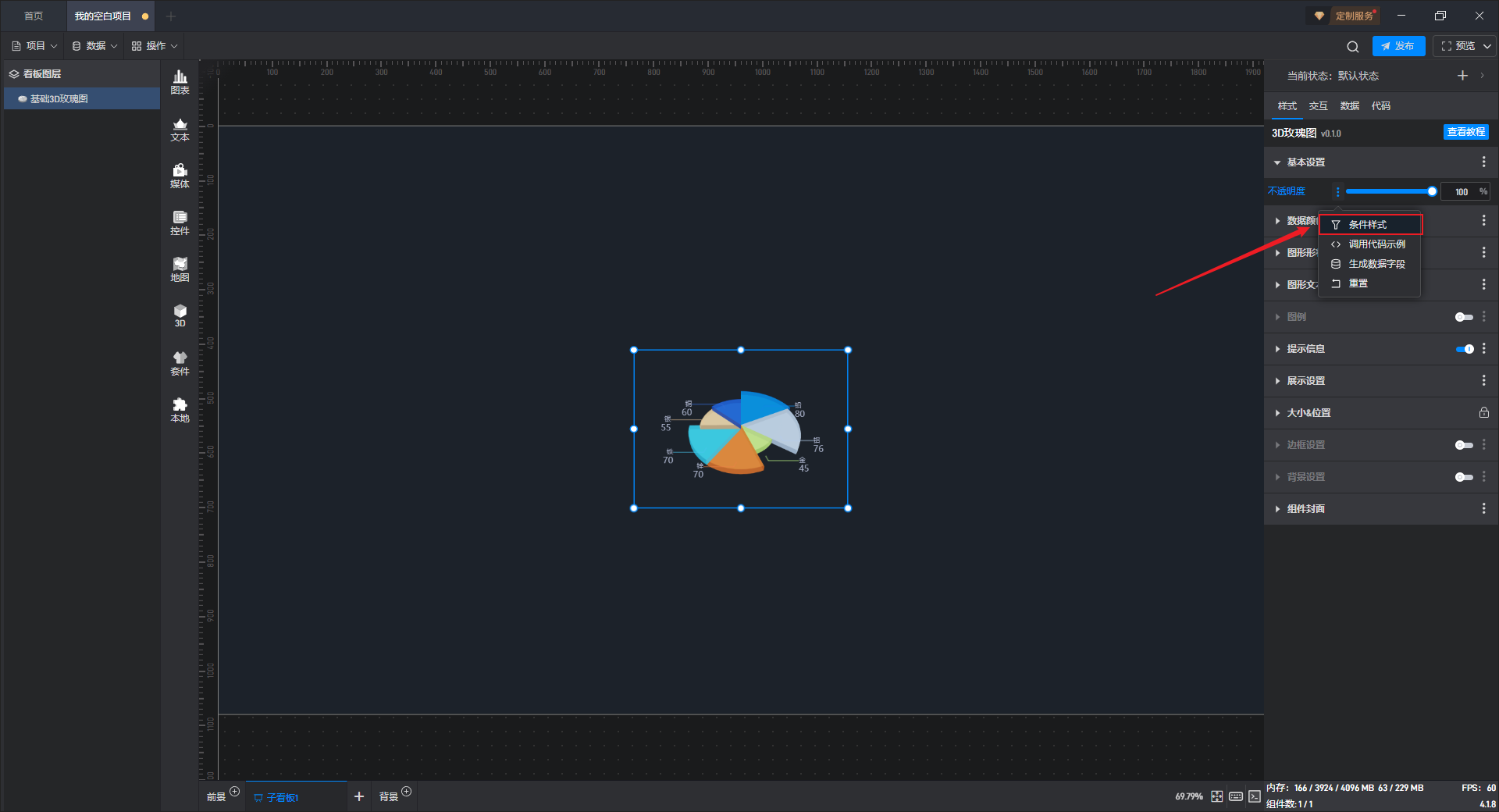 有一些设置项的条件设置方式会直接显示在设置项中,可以直接进行设置,例如比较常用的一个设置就是根据数据条件来改变组件的颜色,但基础 3D 玫瑰图组件目前未提供直接在设置项中设置条件样式的方法。