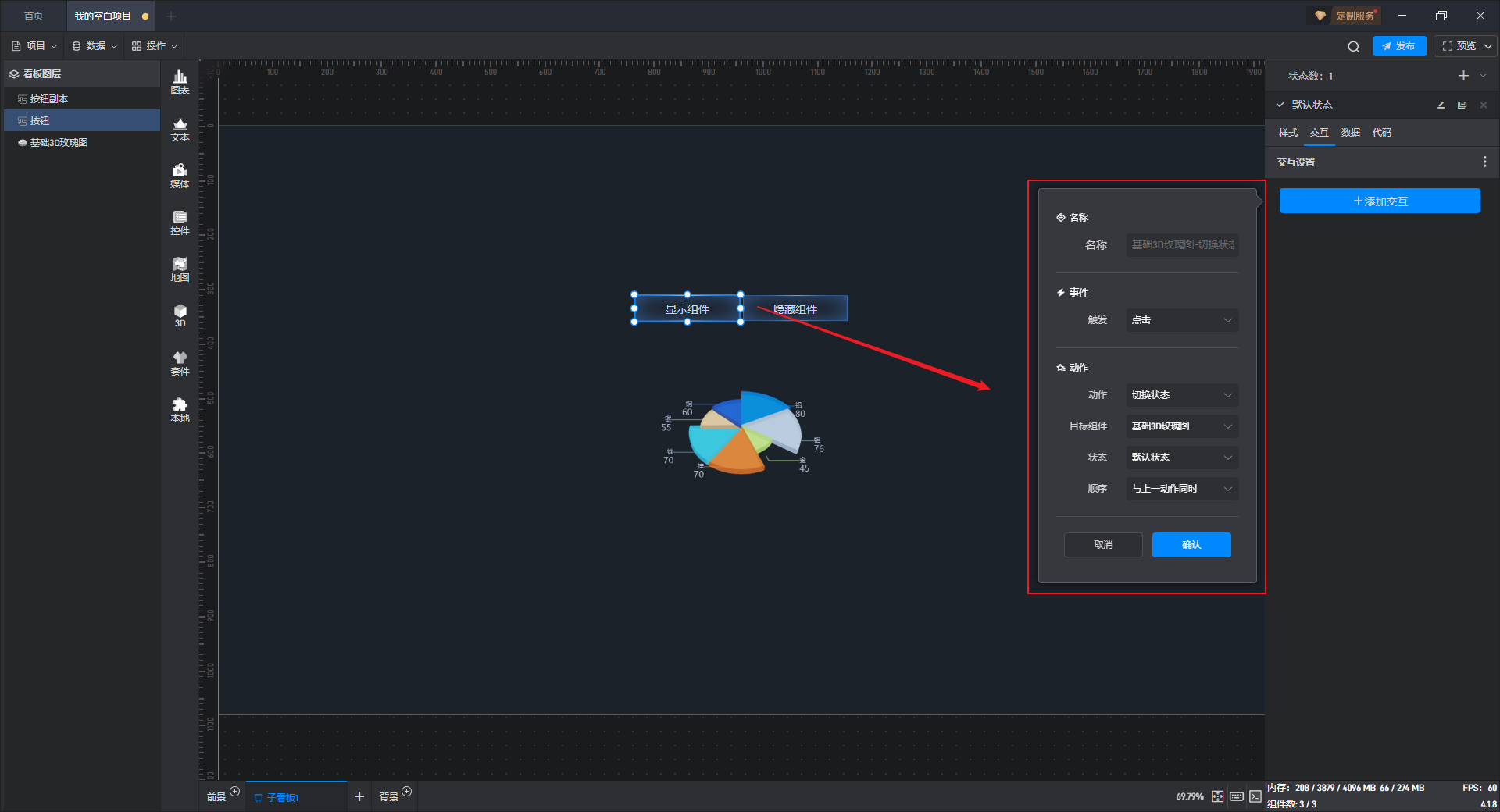 多状态主要用于通过数据条件或是点击交互(通常是点击其他组件来触发本组件的状态切换)来切换组件设置项的场景,这里的设置项包括组件的样式、交互、数据和代码。