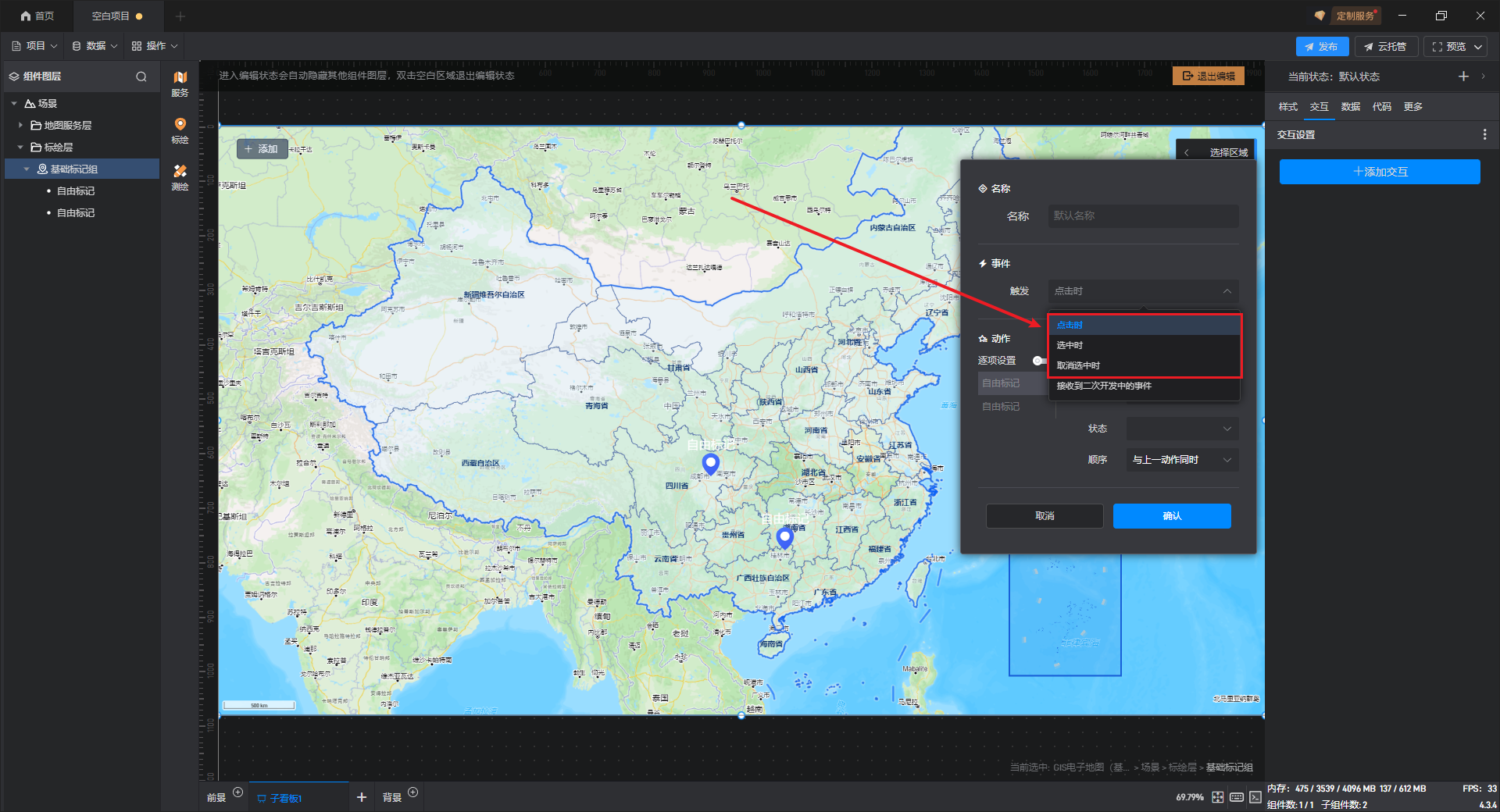 标记点自身的触发主要增加了三个,分别是:“点击标记时”,“选中标记时”和“取消选中时”。