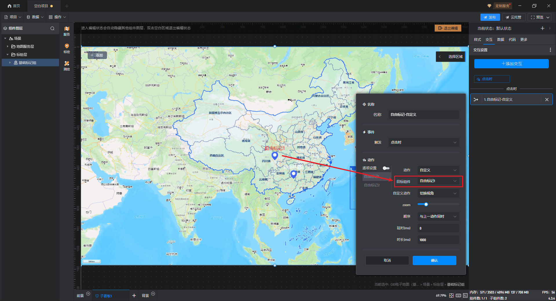 标记点“自定义动作”根据“目标组件”不同,会有不同的设置项,例如当“目标组件”为标记点时,“自定义动作”为“切换到目标视角”。