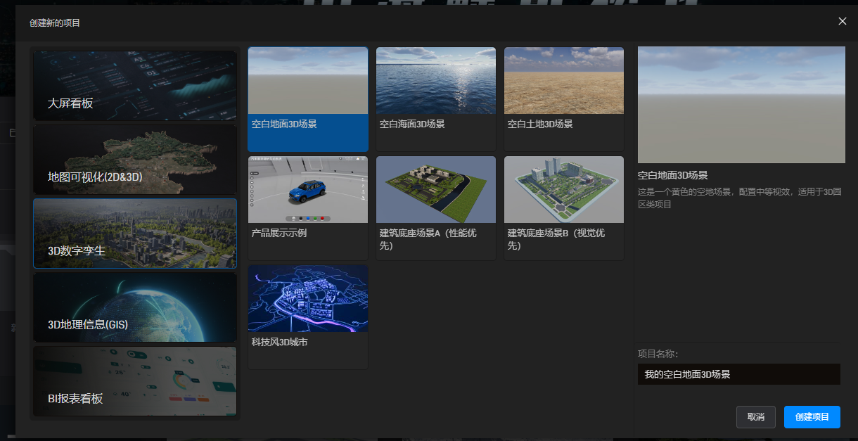 打开山海鲸可视化软件,新建空白地面>创建项目。