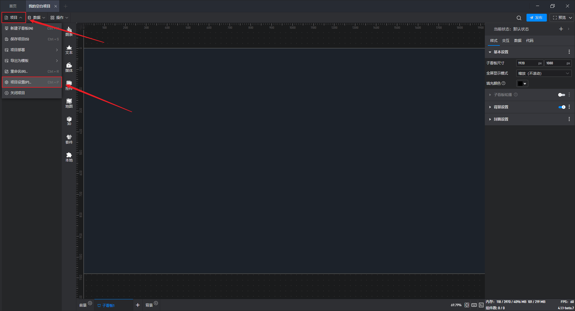 在看板编辑界面左上角“项目”下拉菜单中点击“项目设置”。