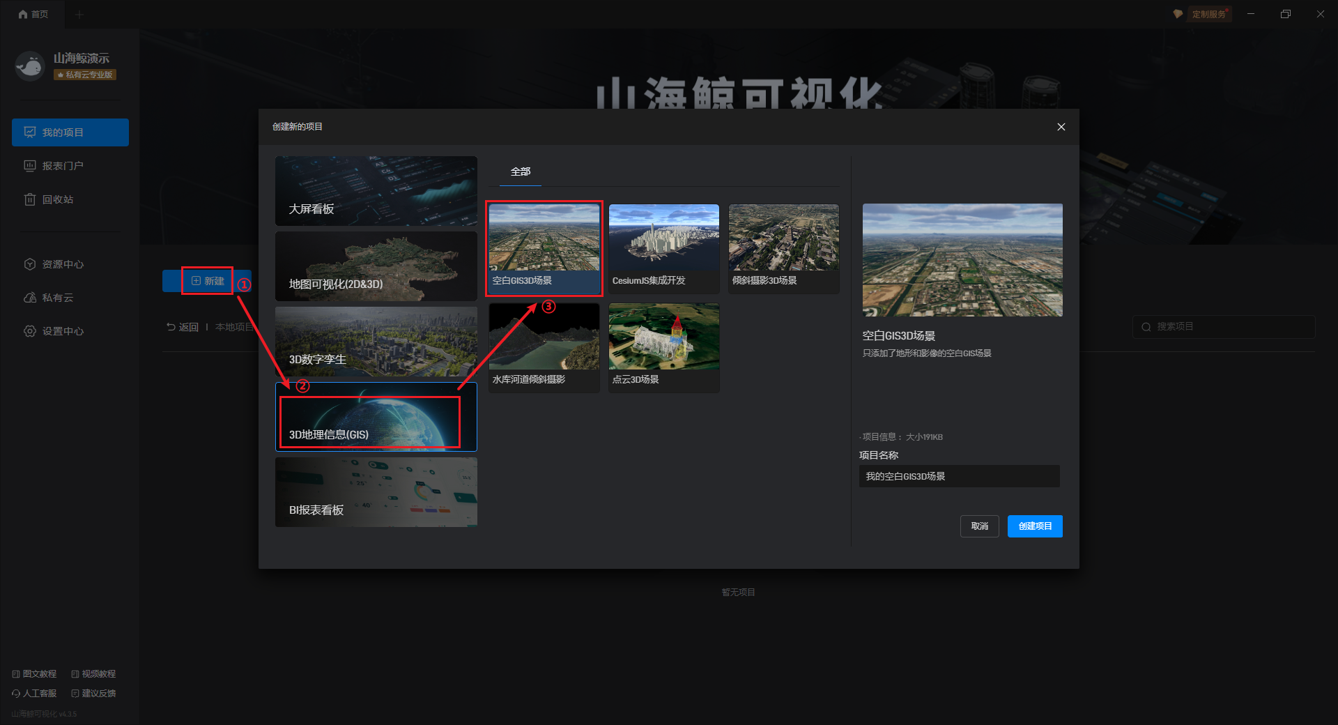 在山海鲸可视化软件“我的项目”中点击“+新建”按钮,选择“3D 地理信息(GIS)”创建一个空白 GIS3D 场景。