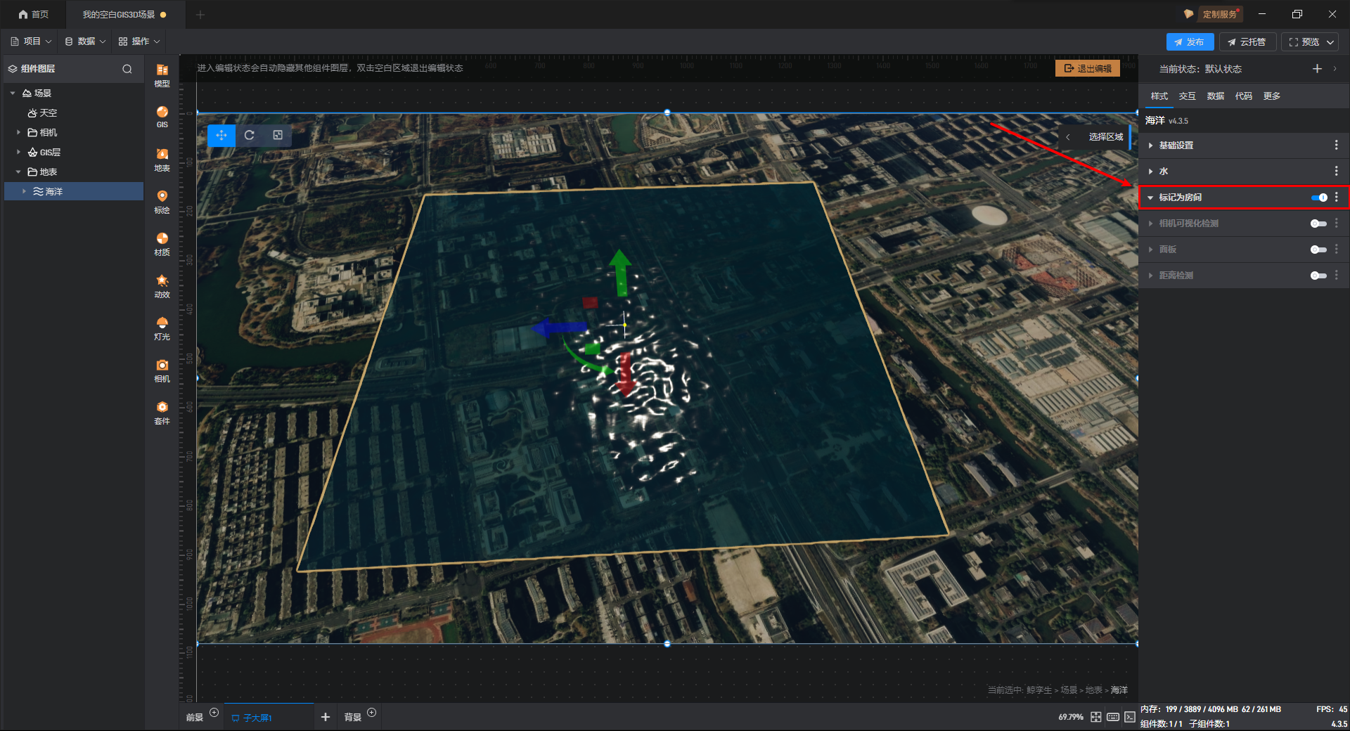 在工具栏中依次点击“地表-水体-海洋”,将海洋添加至场景中。