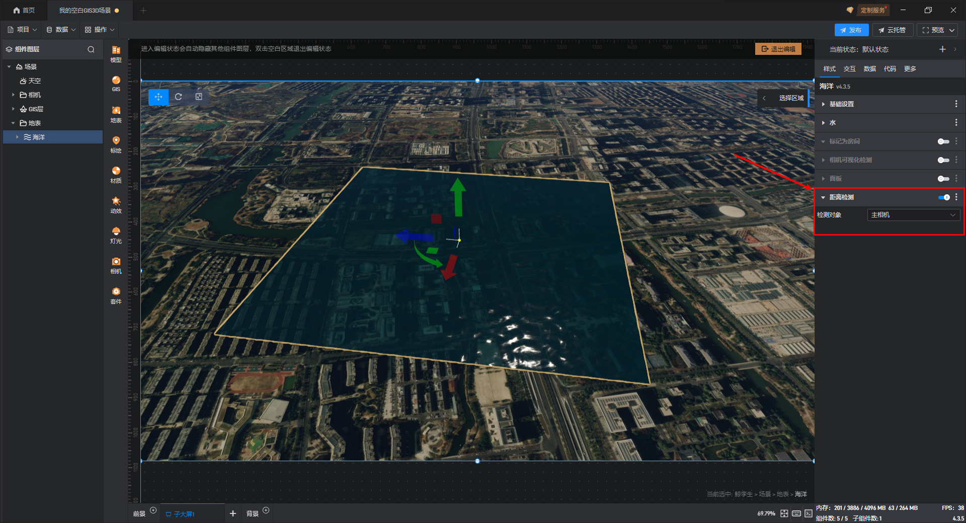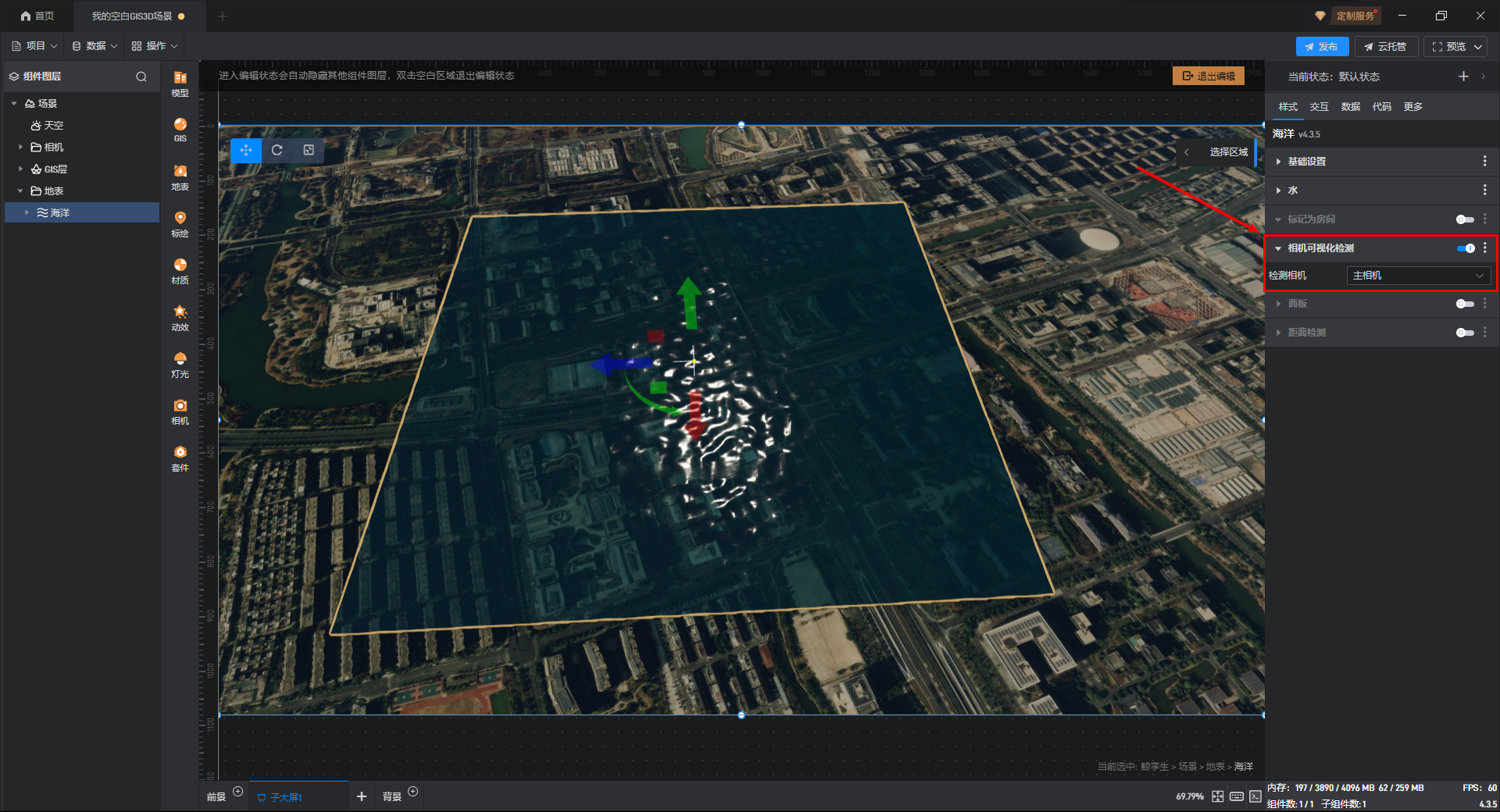 开启相机可视化检测设置项,当海洋进入或者离开相机可视范围时就会触发交互,从而完成预设的动作。(点击查看具体教程 →当前物体进入/离开相机可视范围)
