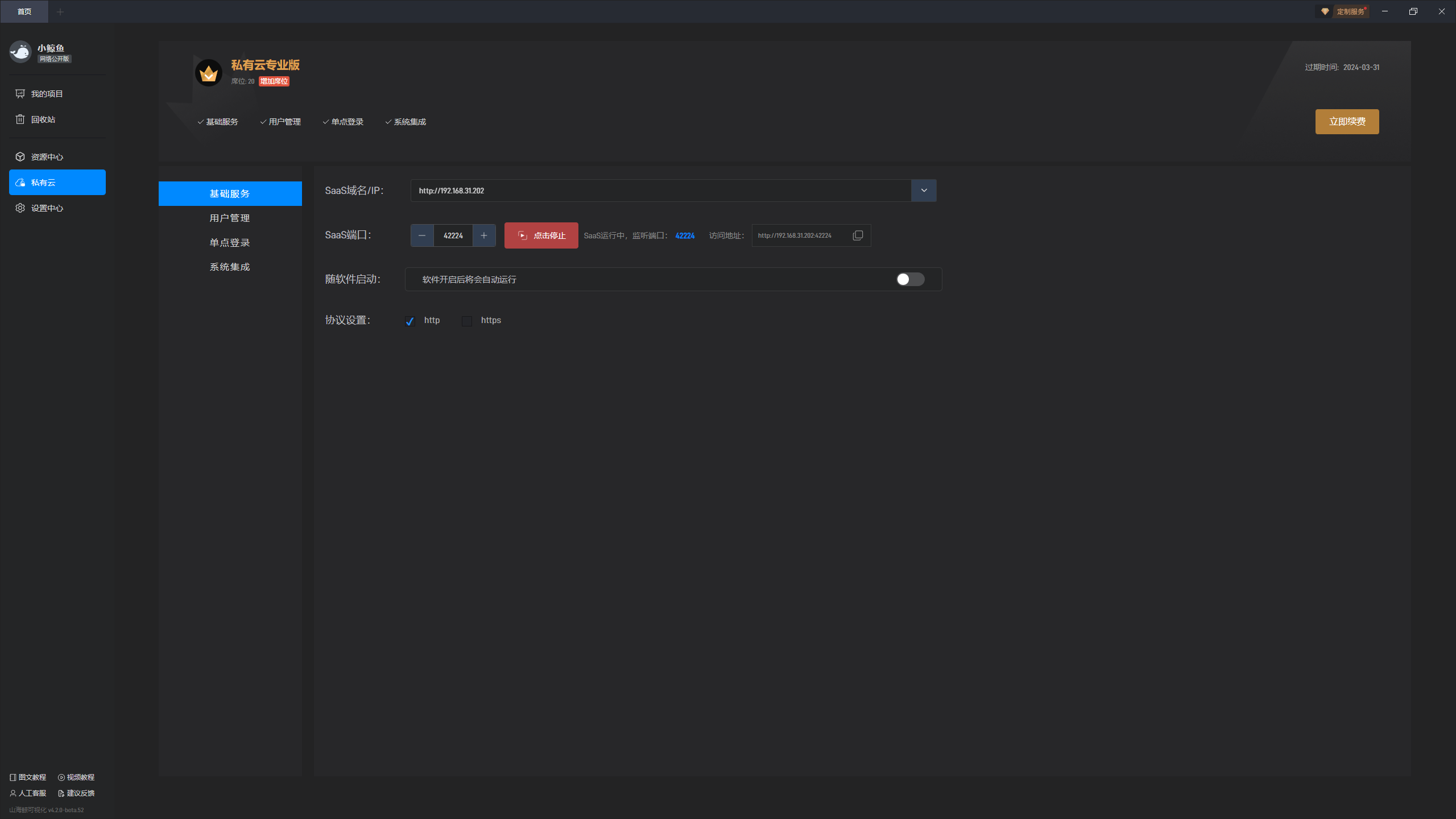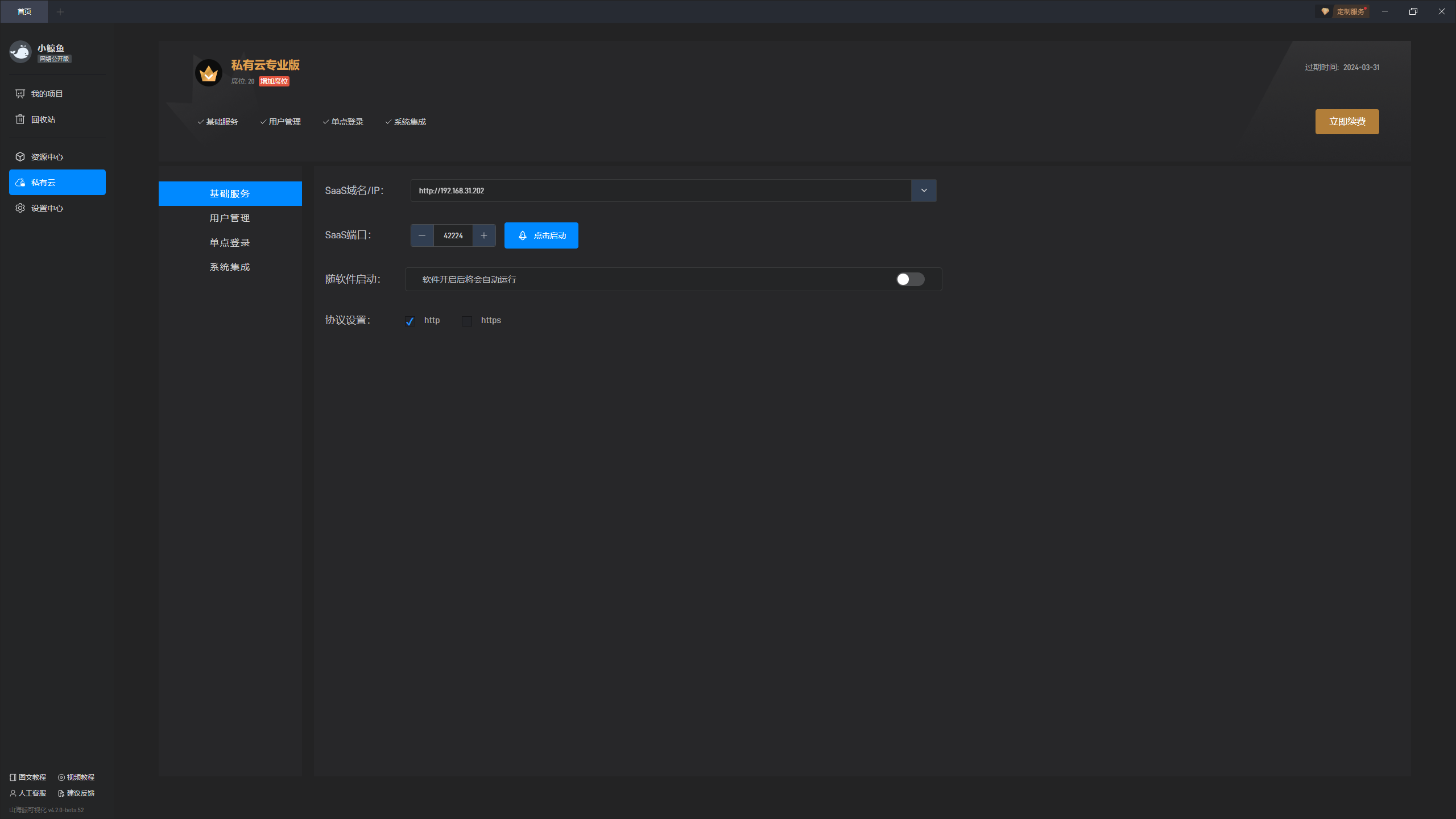 打开软件后,在私有云的基础服务中点击按钮启动 SaaS 服务: