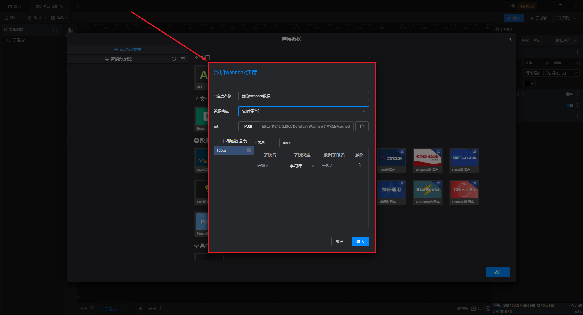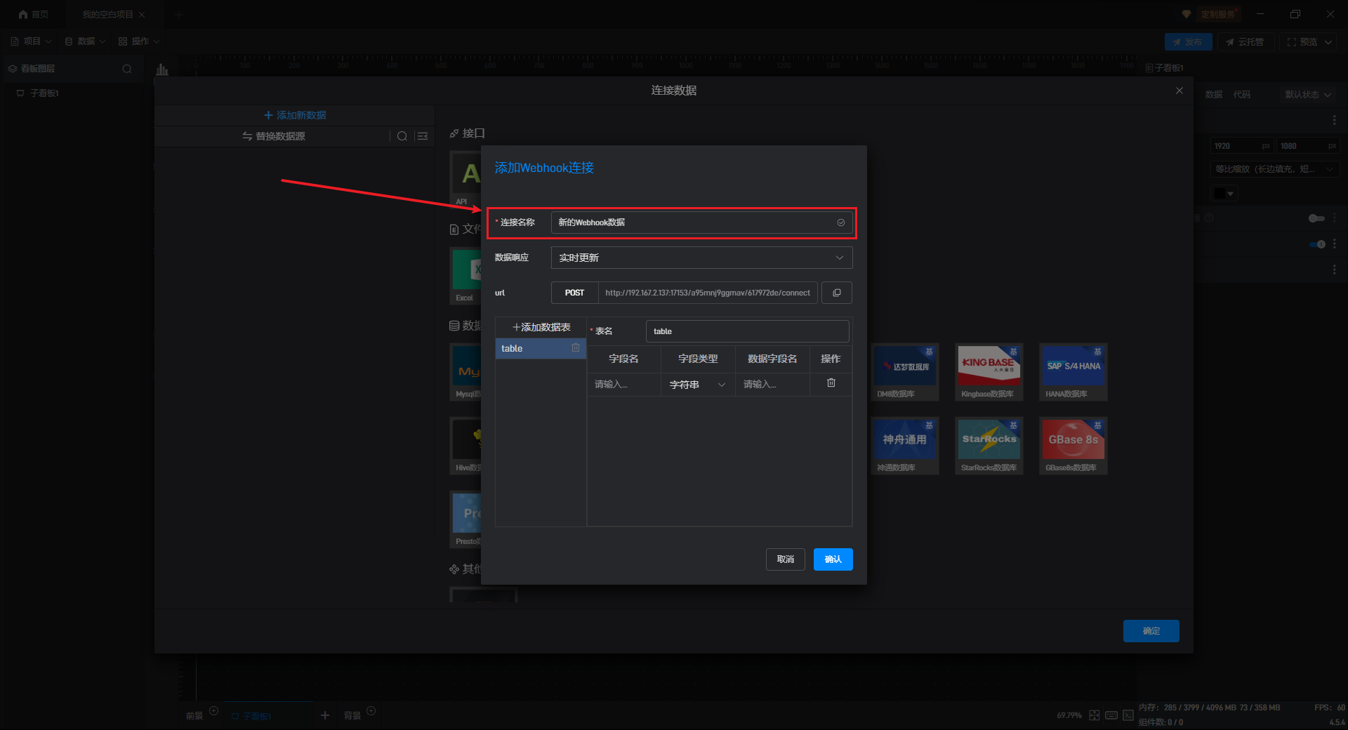 在数据源编辑窗口中,在左侧选择“添加数据”选项卡,然后在右侧点击接口分类中的“Webhook”按钮: