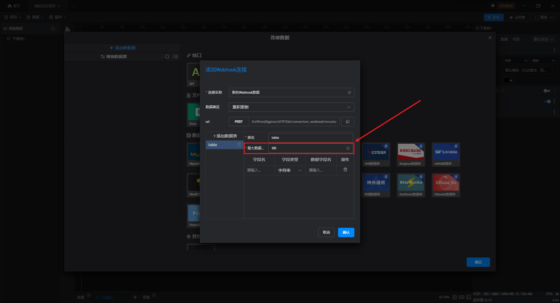 数据响应类型选择“累积响应”时,可在下方设置“最大数据量”,用于限制“累积响应”模式下 Webhook 推送数据的最大保留数量,确保既能连续展示历史,又不会内存溢出或性能下降。