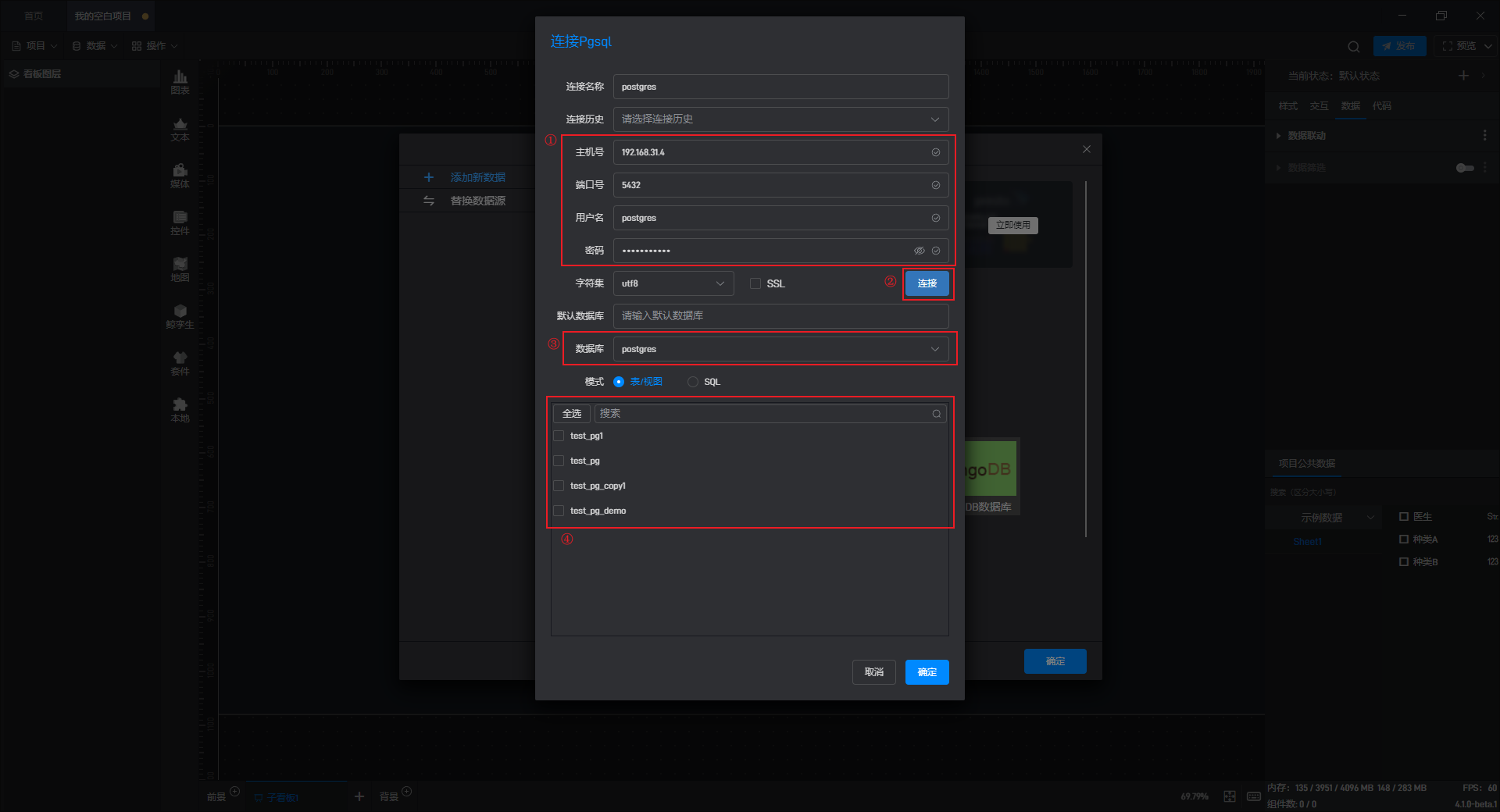 软件会弹出“连接 PgSQL”的设置框,填入需要连接的数据库基本参数,并点击“连接”按钮。软件会自动尝试连接数据库并获取数据库中所有的库。