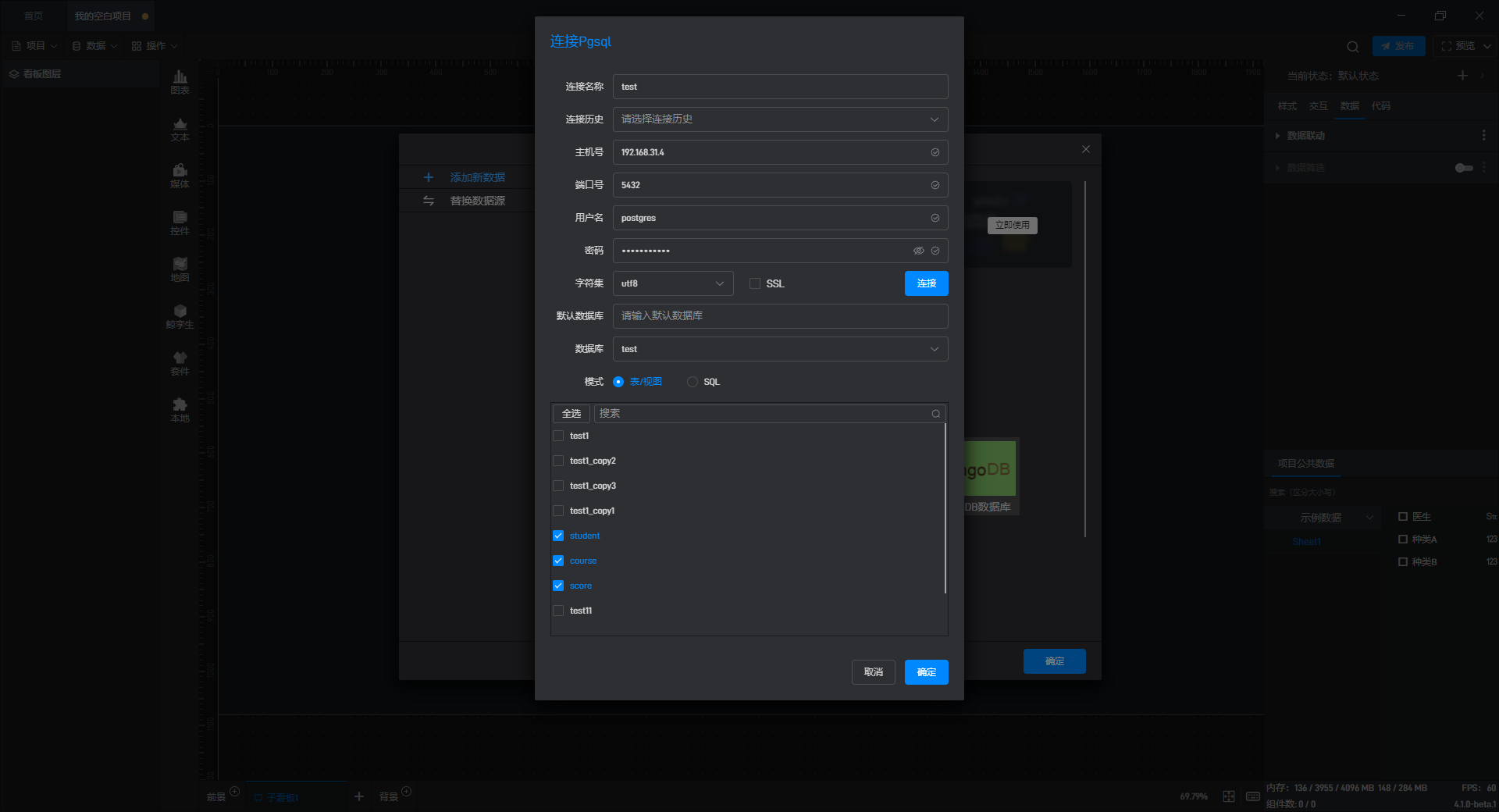 此时,软件会自动加载数据表中的数据并展示在界面中,确认没问题后点击“确定”按钮,一个Pgsql的数据源便添加成功了。