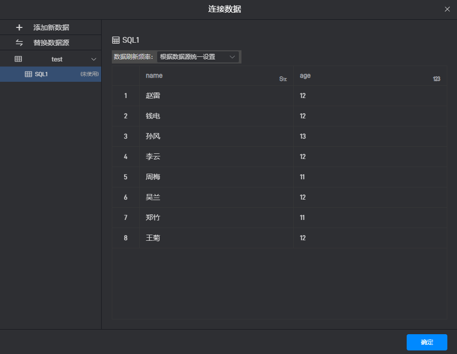点击“连接”按钮后,在“SQL”模式下点击“+添加 SQL 语句”,输入 SQL 语句“SELECT name, age from student”,然后点击“确定”,就可以进行数据筛选的操作。