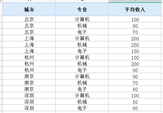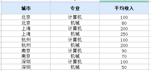 数据内容如下,“城市”为 X 轴字段,“专业”为系列字段,“平均收入”为 Y 轴字段。