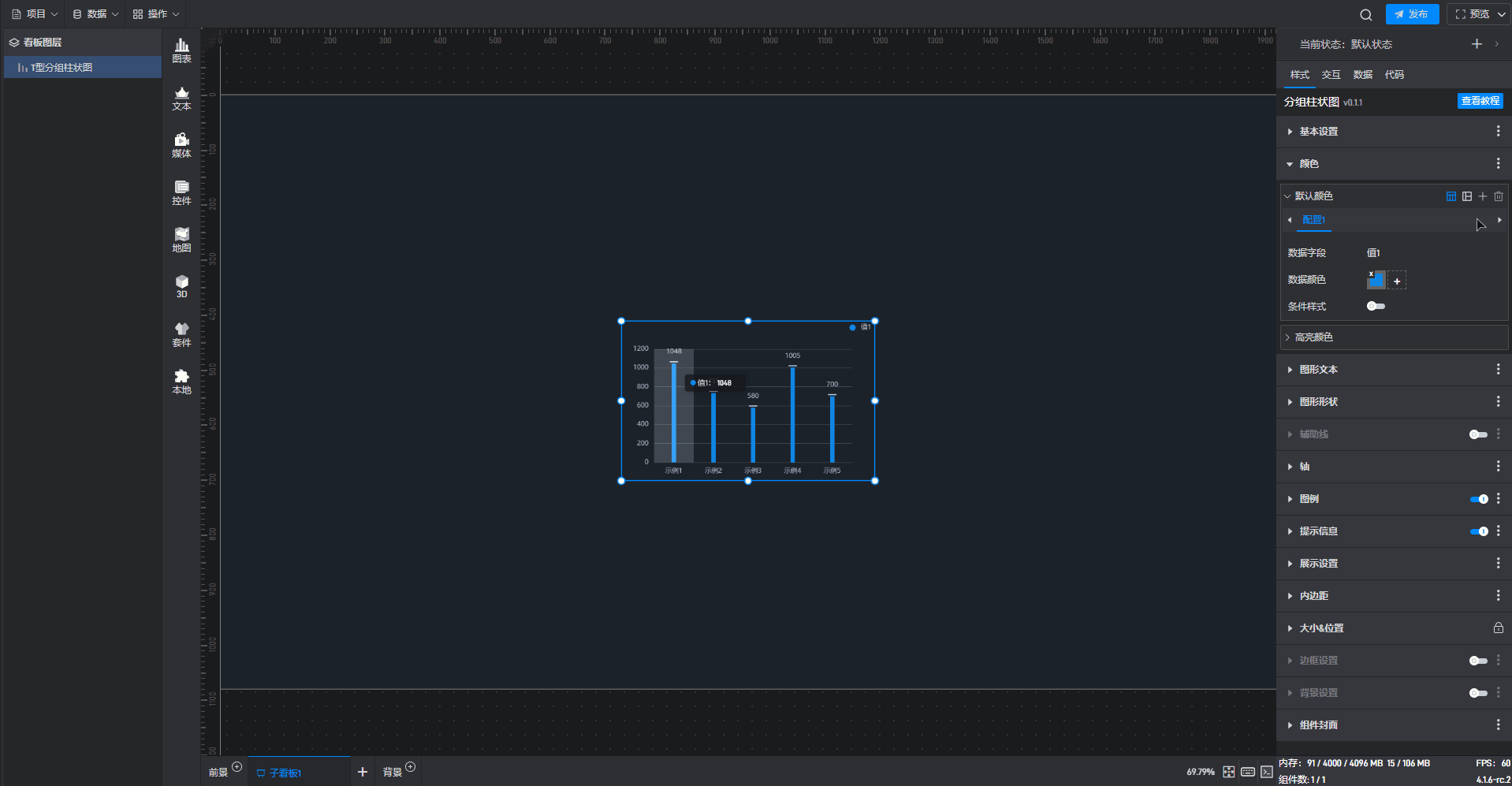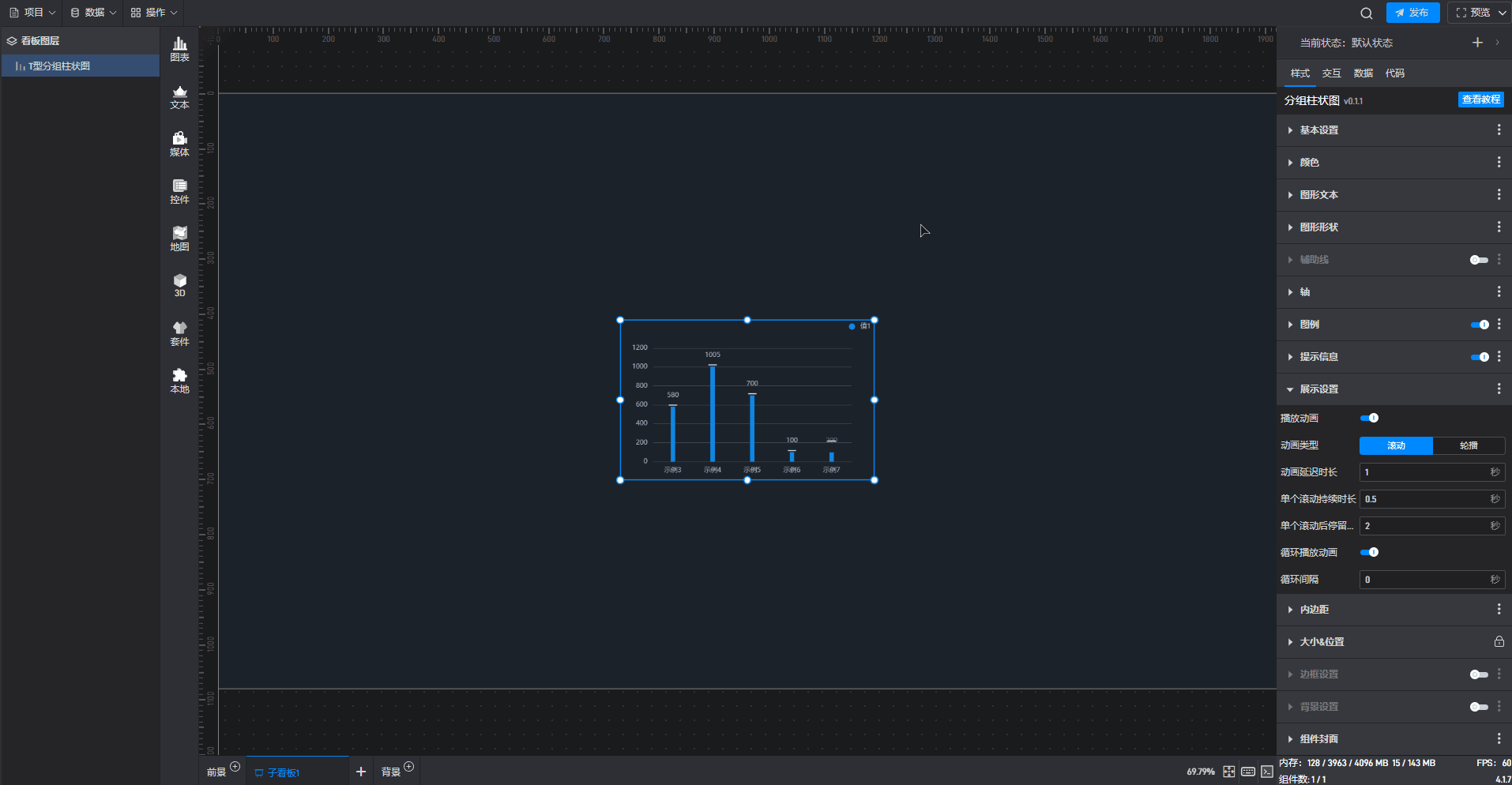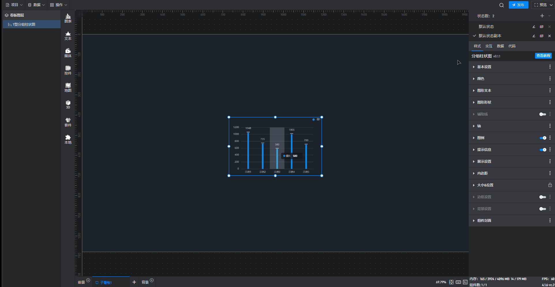 T 型分组柱状图、基础分组柱状图 2、基础分组柱状图 3都是分组柱状图的预设样式,预设的样式主要包括组件自有数据、图形形状、颜色和数量,但是本质上这三种组件都是分组柱状图。