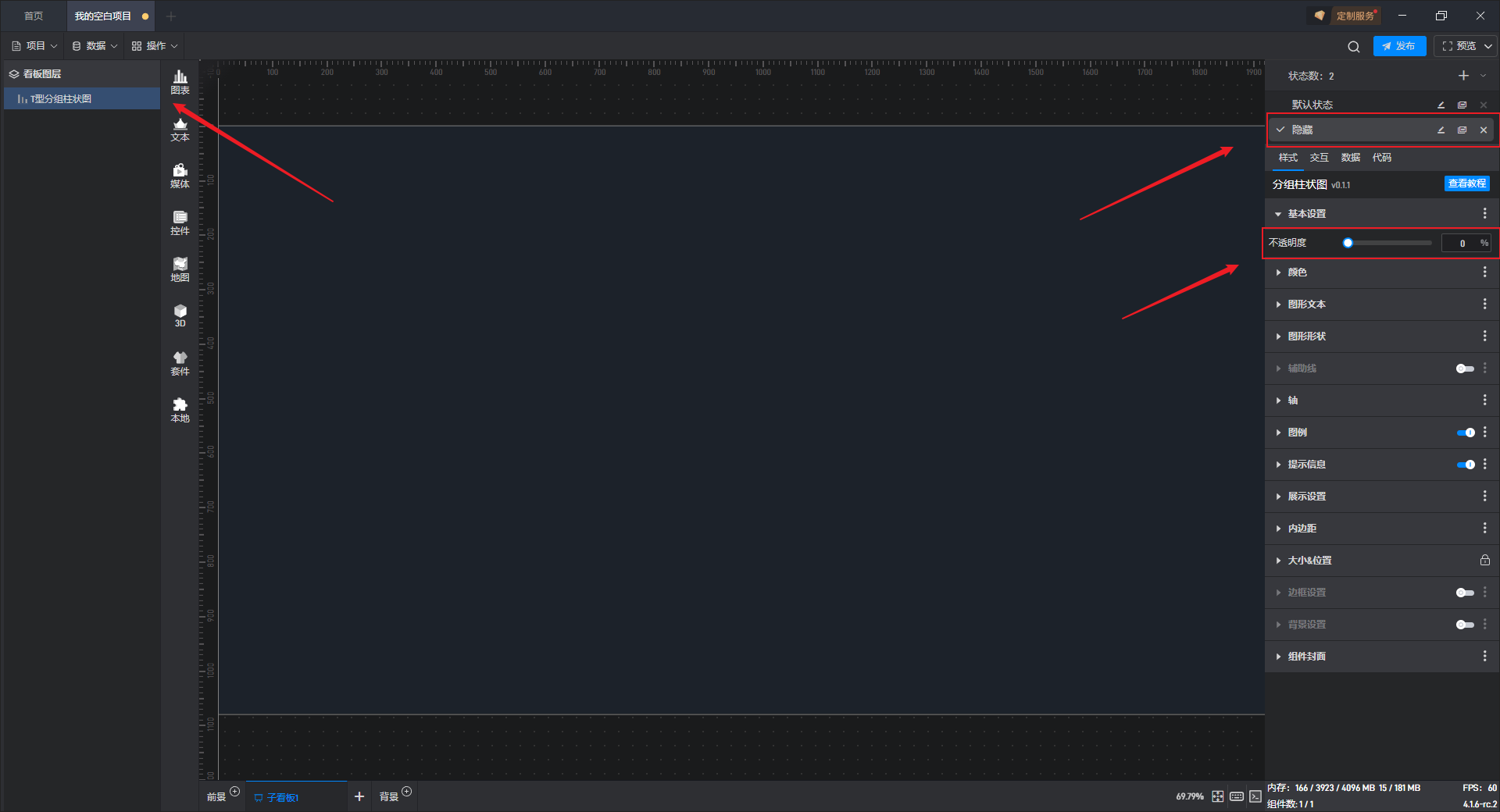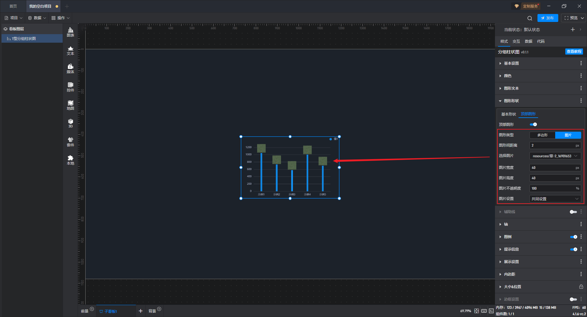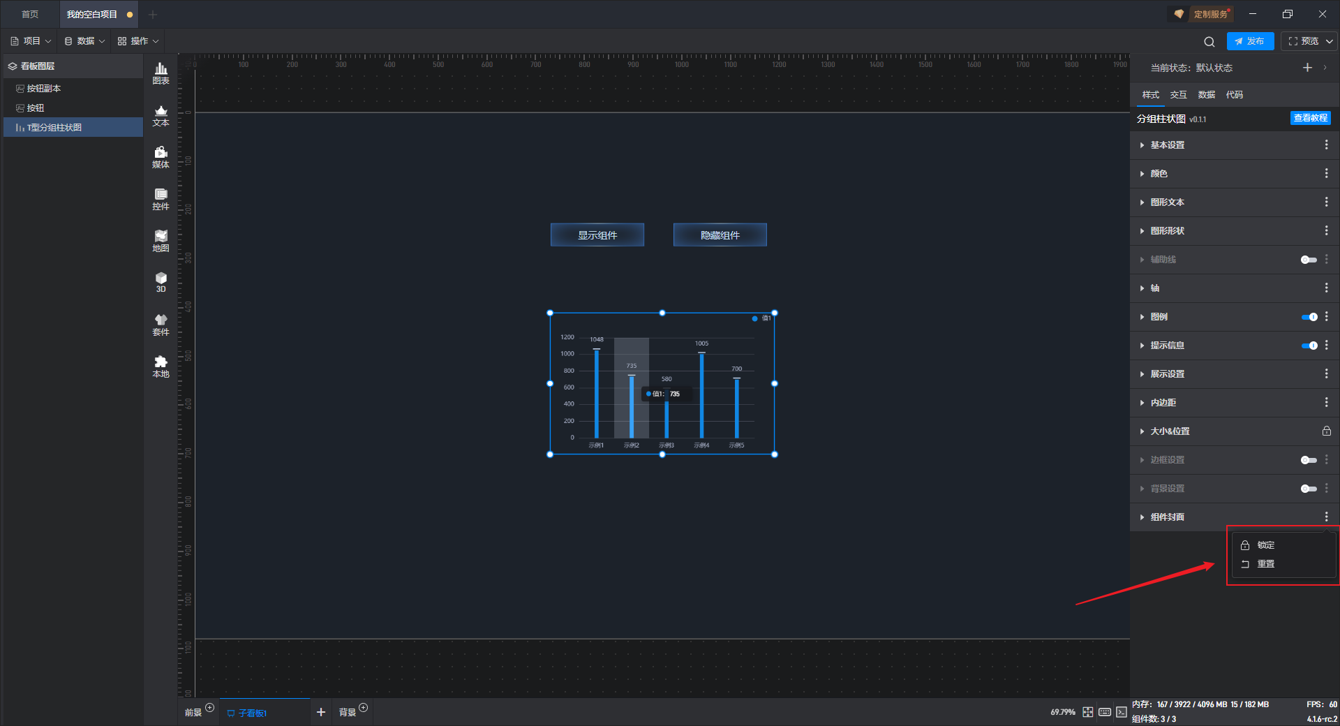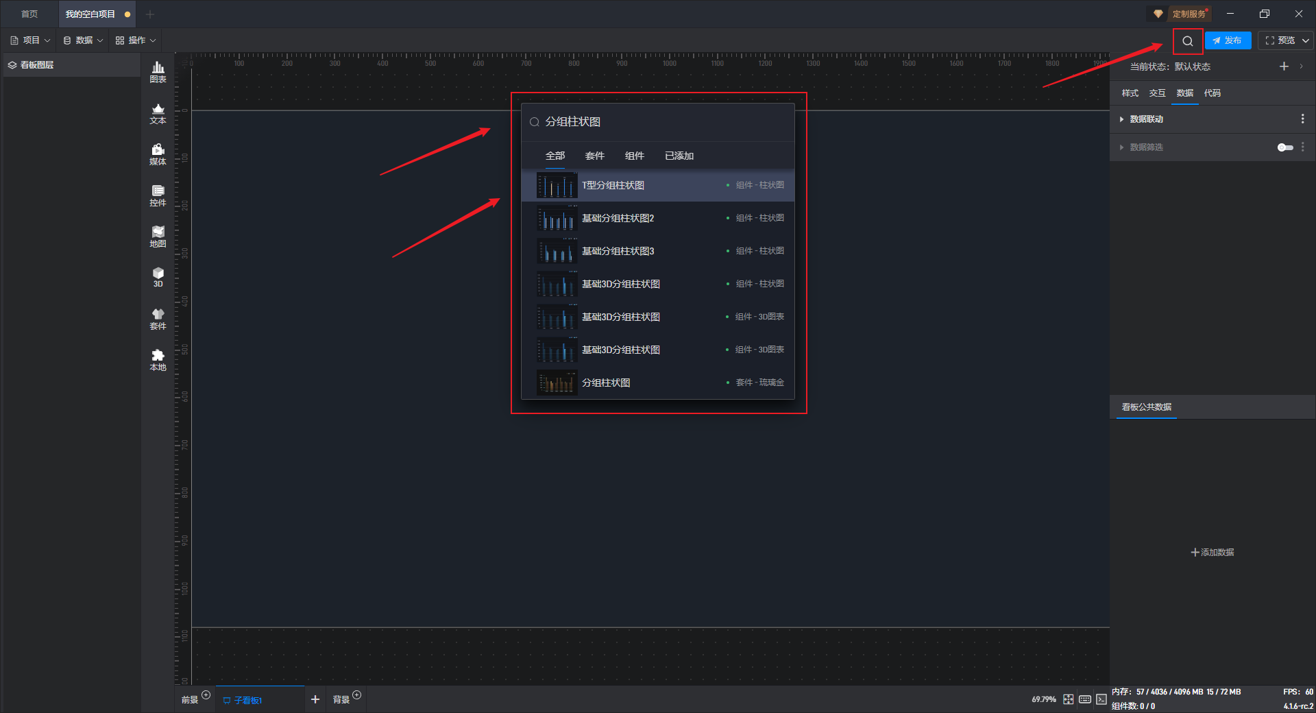 T 型分组柱状图、基础分组柱状图 2、基础分组柱状图 3都是分组柱状图的预设样式,预设的样式主要包括组件自有数据、图形形状、颜色和数量,但是本质上这三种组件都是分组柱状图。