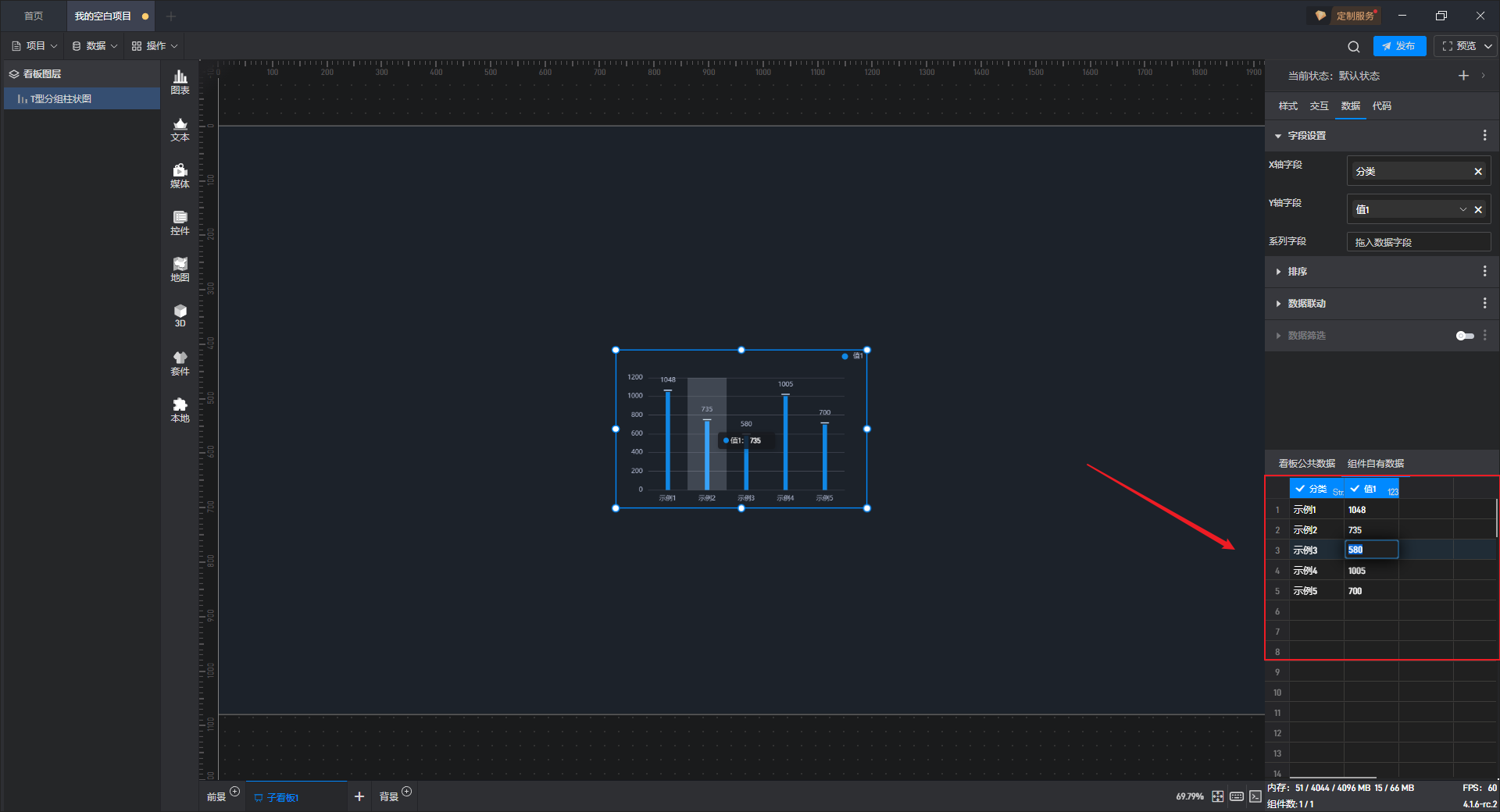 在“数据”设置界面下方可以直接修改数据,组件中的数据也会实时更新。