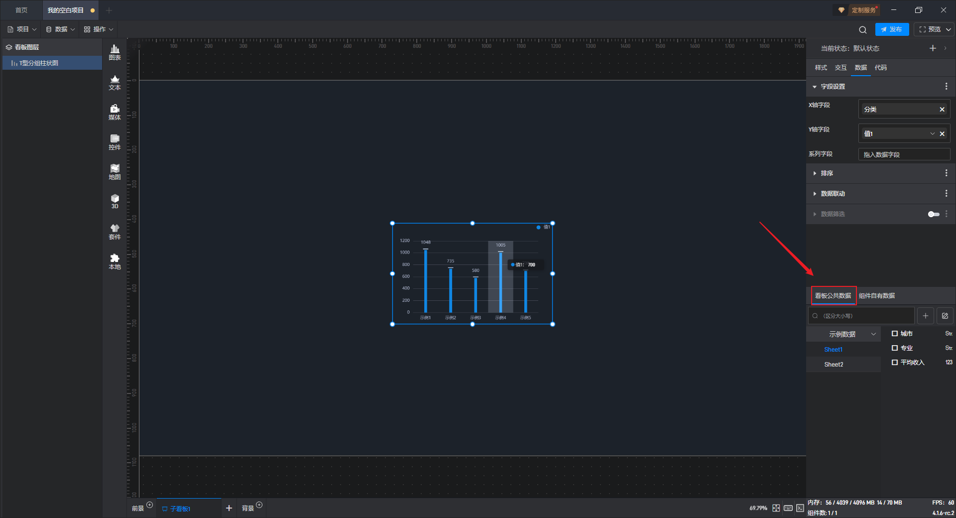 点击选中组件,在右侧“数据”设置窗口中切换到“看板公共数据”(同一个项目中所有数据源是共享的)。