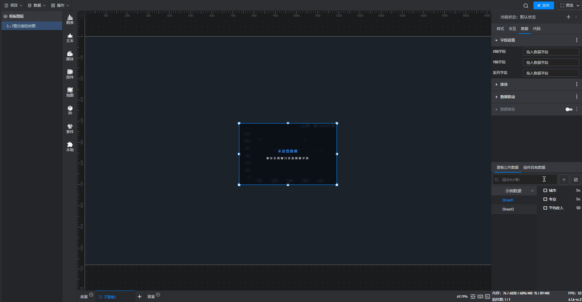 删除当前字段后,右侧字段栏为空,同时组件会提示“未设置数据”。