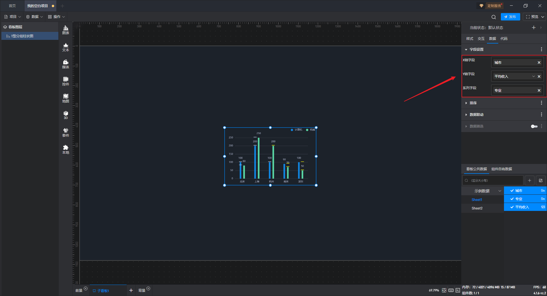 这种数据类型是一个 X 轴字段、一个系列字段和一个 Y 轴字段,其中 X 轴字段对应 X 轴坐标分类,系列字段对应柱子,所以可以通过修改系列字段进行柱子数量的调整(例如在下面的数据中对专业类型进行调整)。