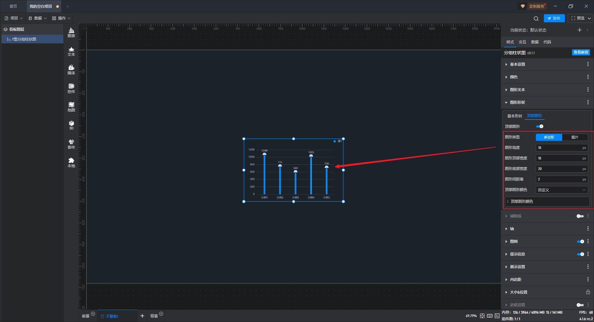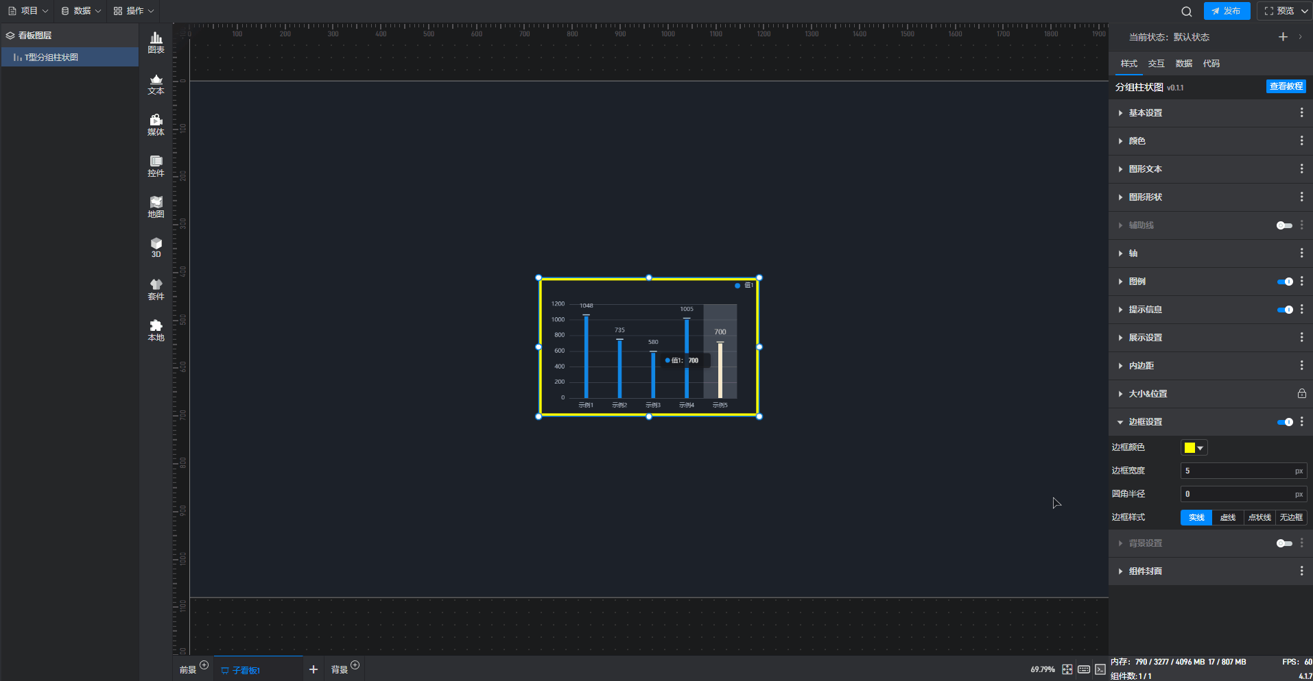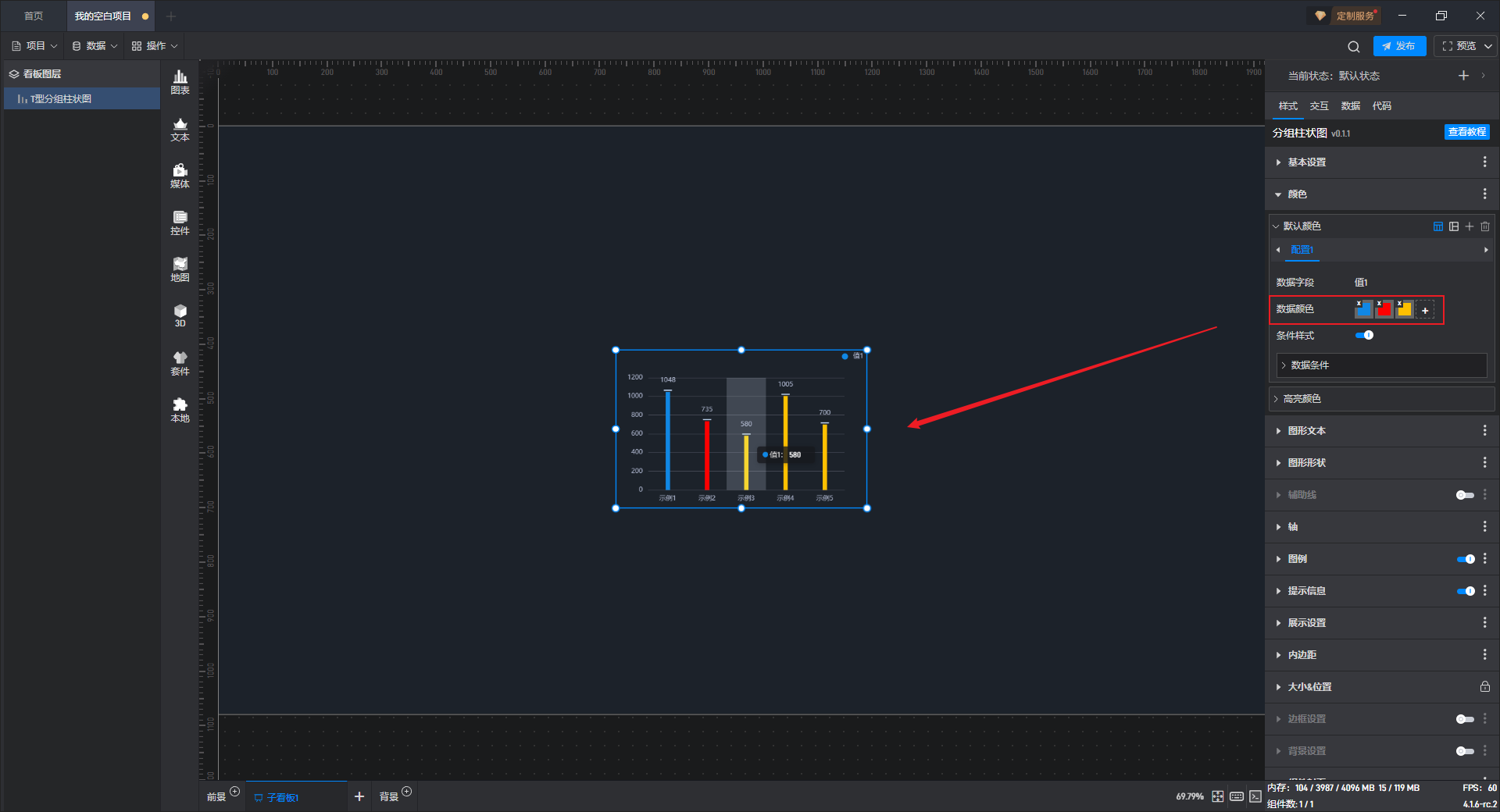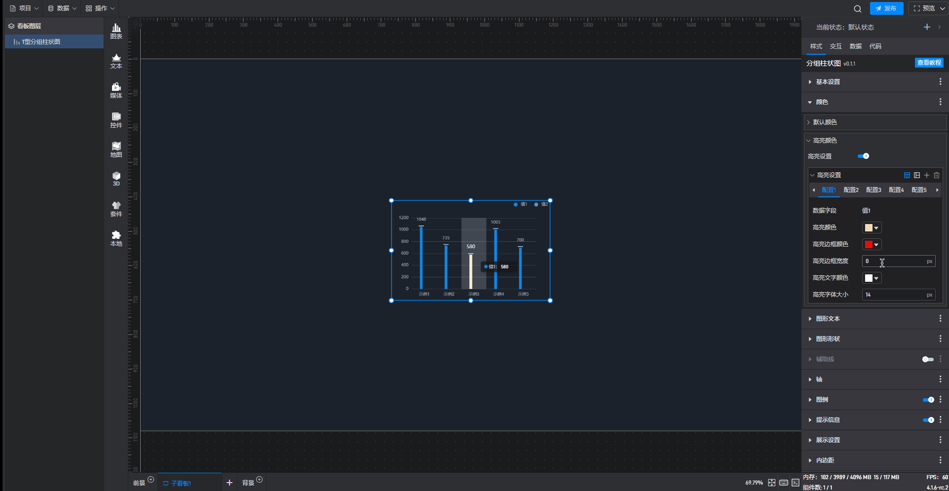 开启高亮设置,并设定高亮颜色、边框宽度等,就可以看到组件在显示对应数据柱子时会显示设置的高亮颜色。